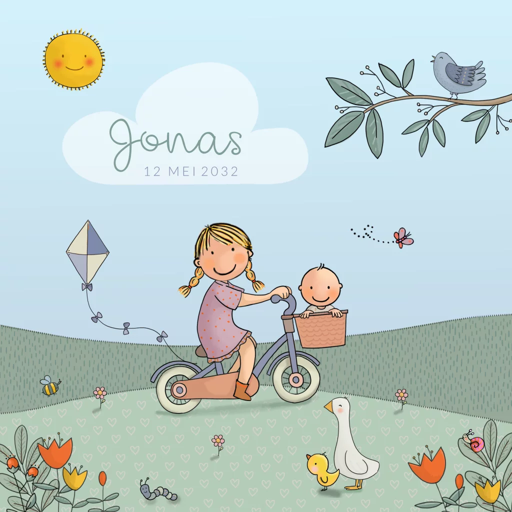 Nieuw broertje of zusje op komst? Hoe leuk is het dan om je geboortekaartje aan te passen aan het aantal kinderen dat je al hebt. Dit geboortekaartje lente zusje met bakfiets jongen is perfect voor een tweede of derde kindje. Het kaartje is kleurrijk en vrolijk, met een grappige illustratie van een jongen op een bakfiets. De perfecte manier om je geboortekaartje af te maken is met een leuke foto van het nieuwe gezinslid.