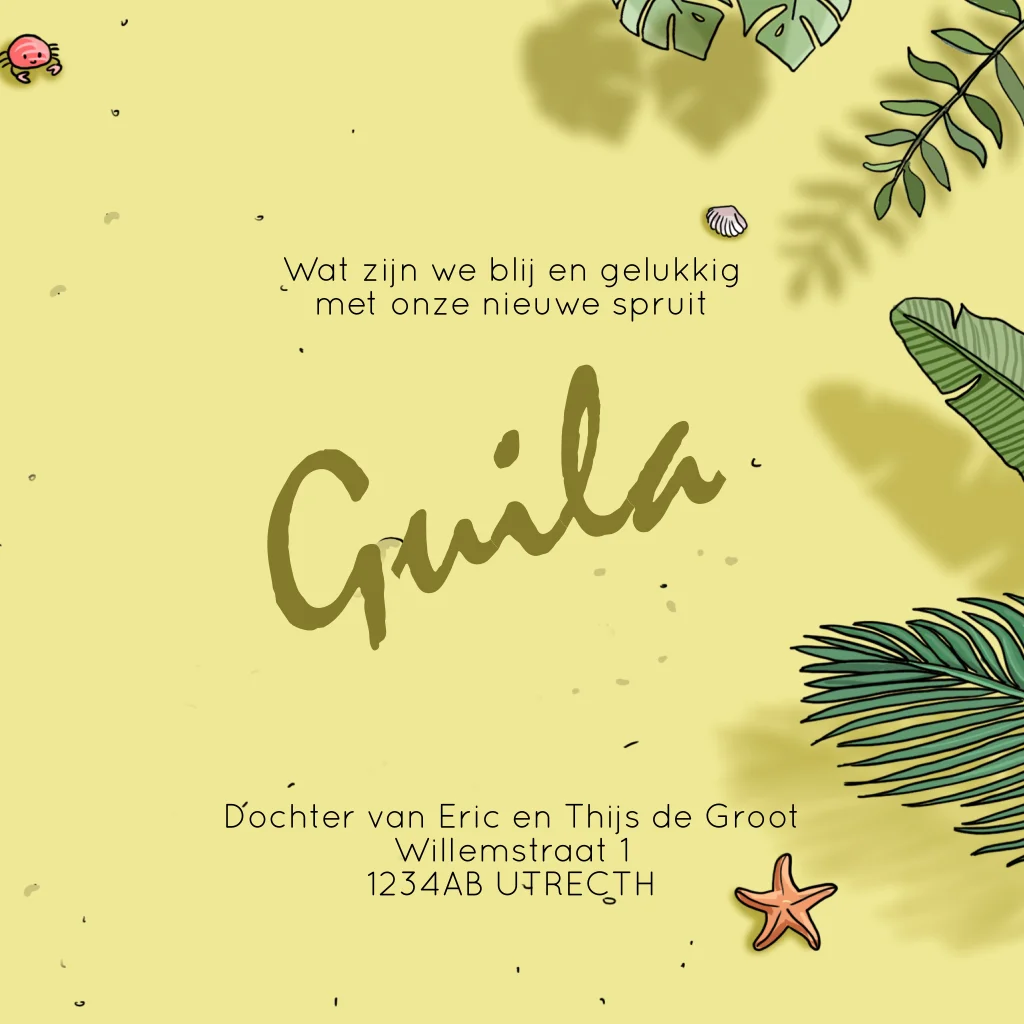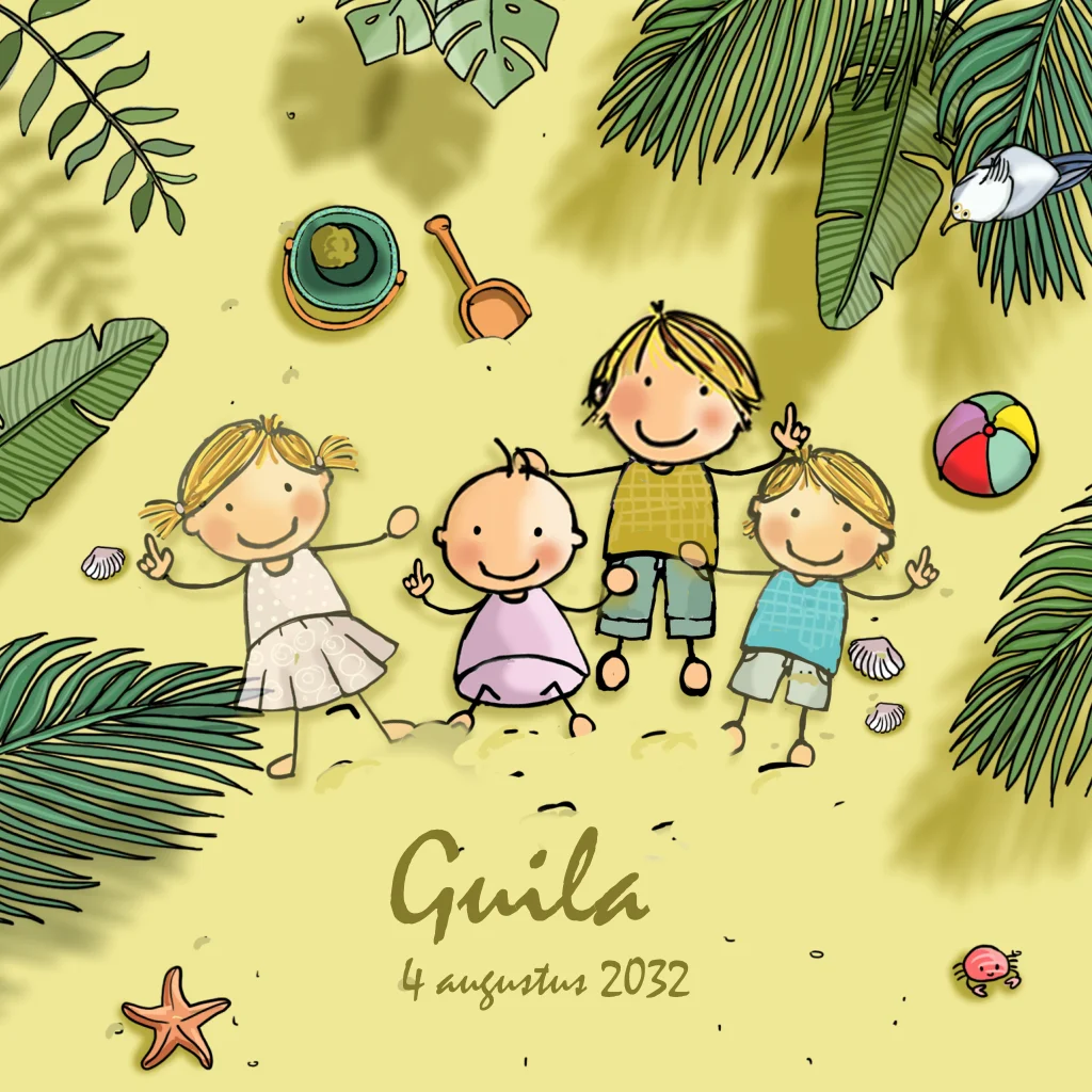 Geboortekaartje meisje baby strand met broertje en zusje, lief kaartje geheel met de hand geïllustreerd in heldere en vrolijke kleuren. Zomers en fris.