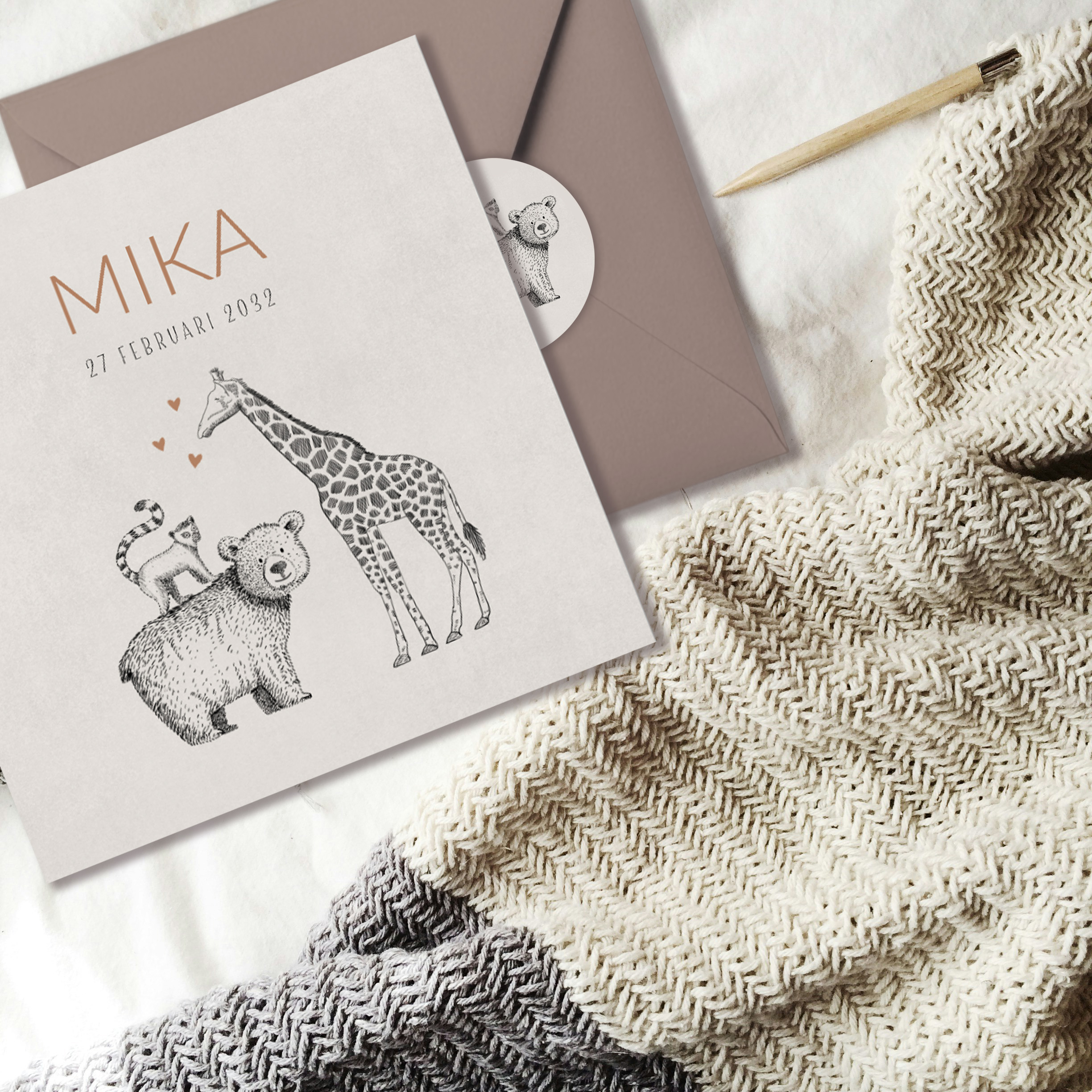 Geboortekaartje neutraal lijntekening beer giraf aap