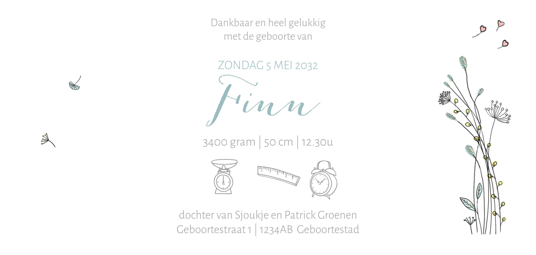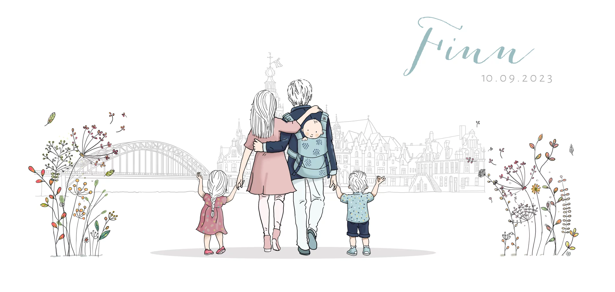 Geboortekaartje met lopende ouders achterkant met baby jongen in rugzak. Broertjes en zusjes lopen er langs. Op de achtergrond kun je kiezen uit een stad, dorp of iets anders. Voorbeeld kaartje heeft Nijmegen als beeld.