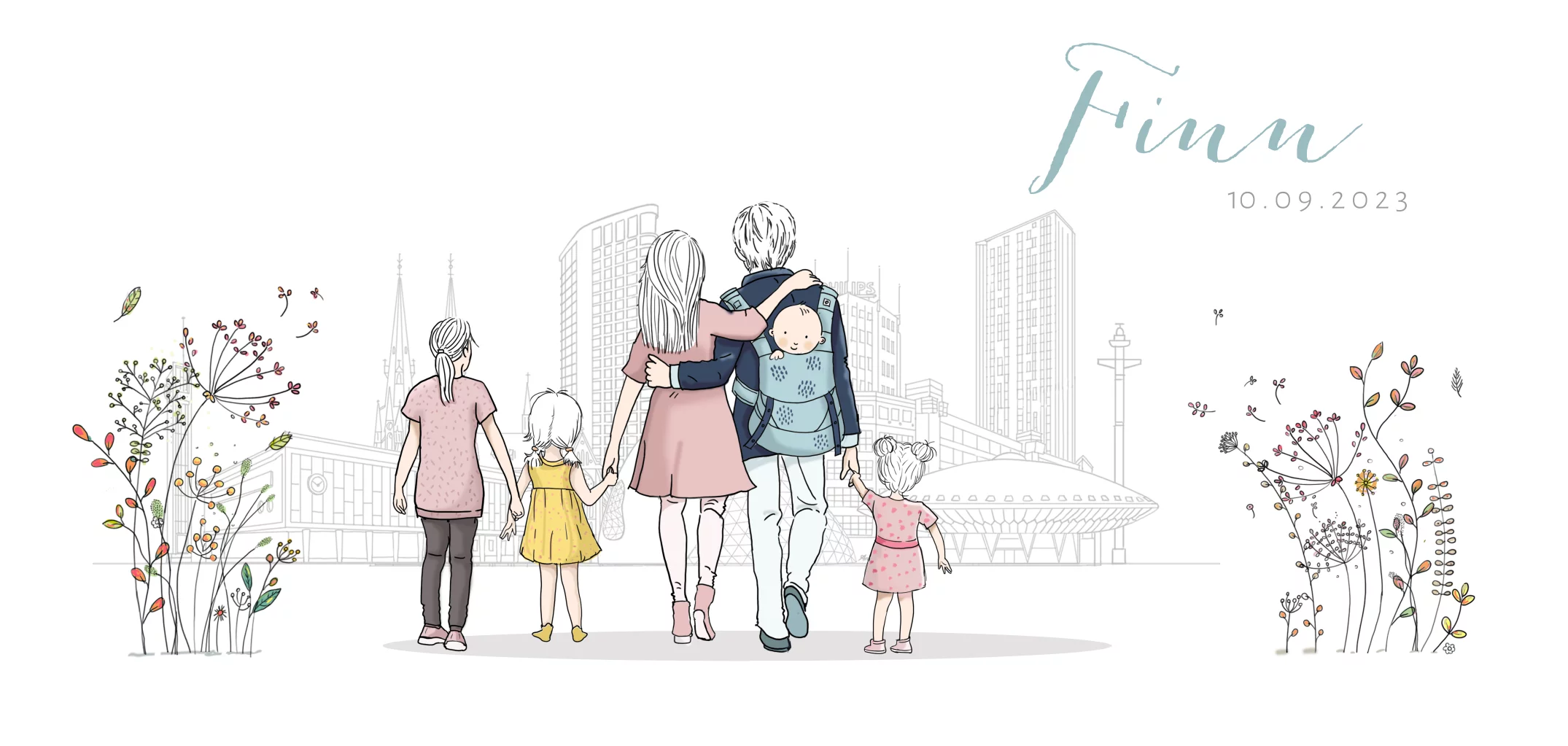 Geboortekaartje met lopende ouders achterkant met baby jongen in rugzak. Broertjes en zusjes lopen er langs. Op de achtergrond kun je kiezen uit een stad, dorp of iets anders. Voorbeeld kaartje heeft Eindhoven als beeld.