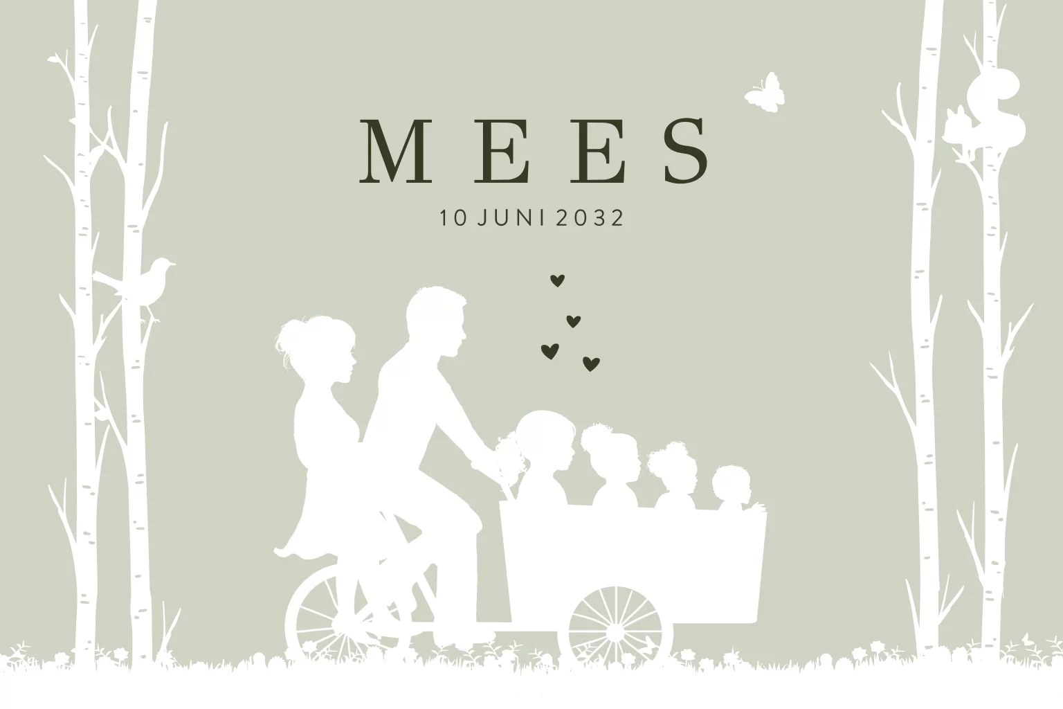 Geboortekaartje ouders met bakfiets en vier kinderen