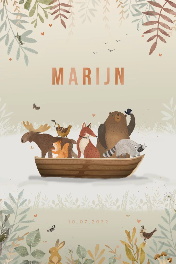 Prachtige geboortekaartje staand enkel bootje met bosdieren in prachtige tinten. Deze kaart is perfect voor een eerste kindje. Het is ook een trendy en natuurlijke keuze voor een zonnige zomer.