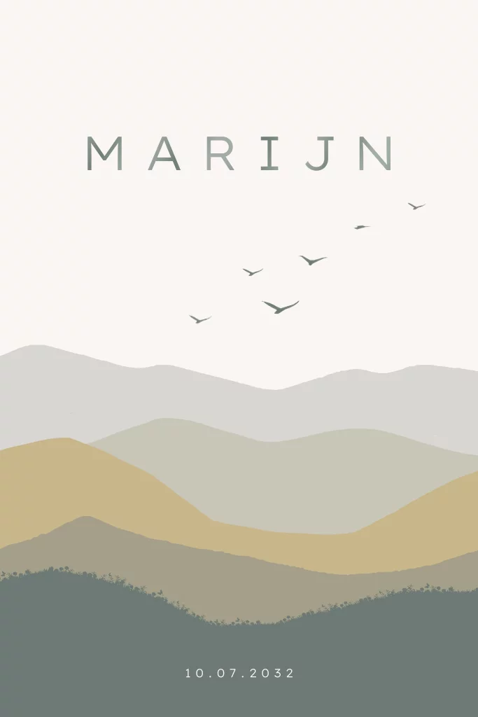 Prachtige geboortekaartje staand enkel jongen landschap met vogels in prachtige tinten. Deze kaart is perfect voor een eerste kindje. Het is ook een trendy en natuurlijke keuze voor een zonnige zomer.