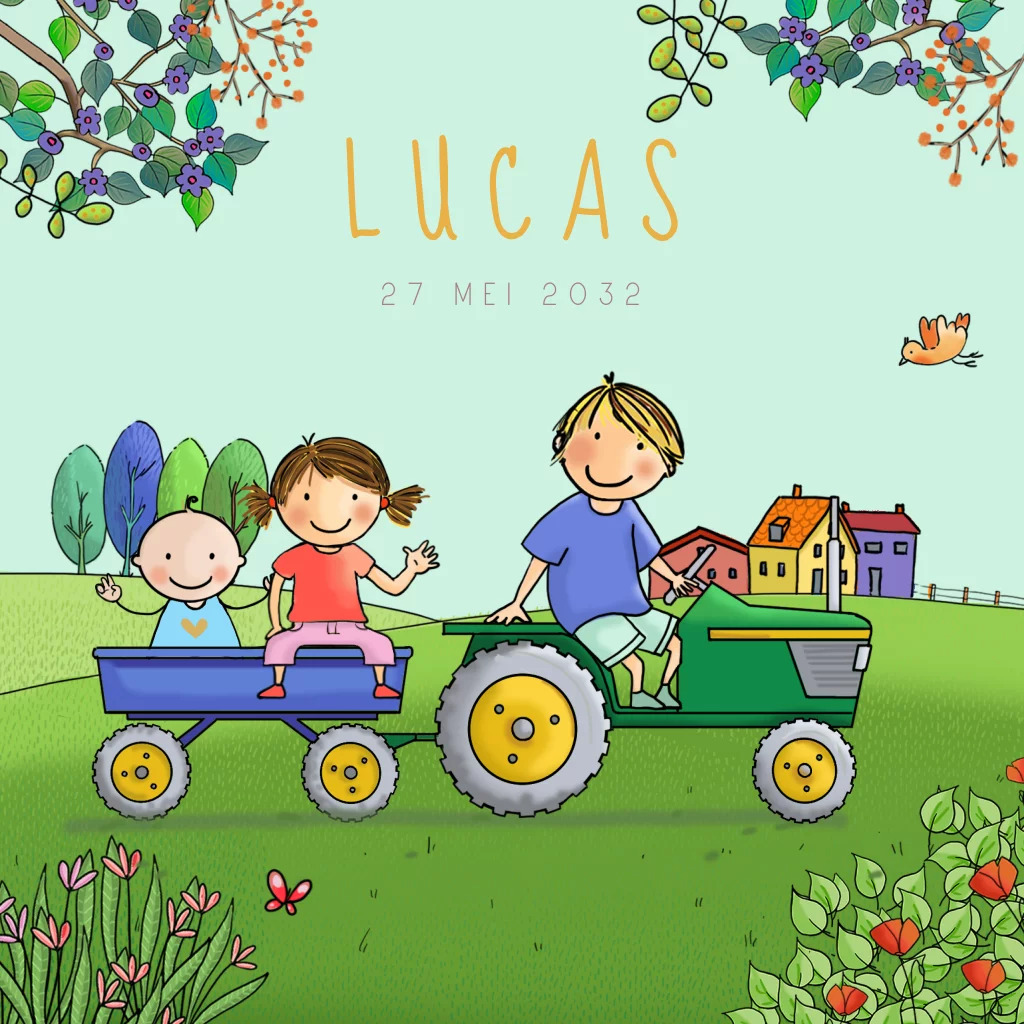 Geboortekaartje tractor groen met blauwe aanhangwagen