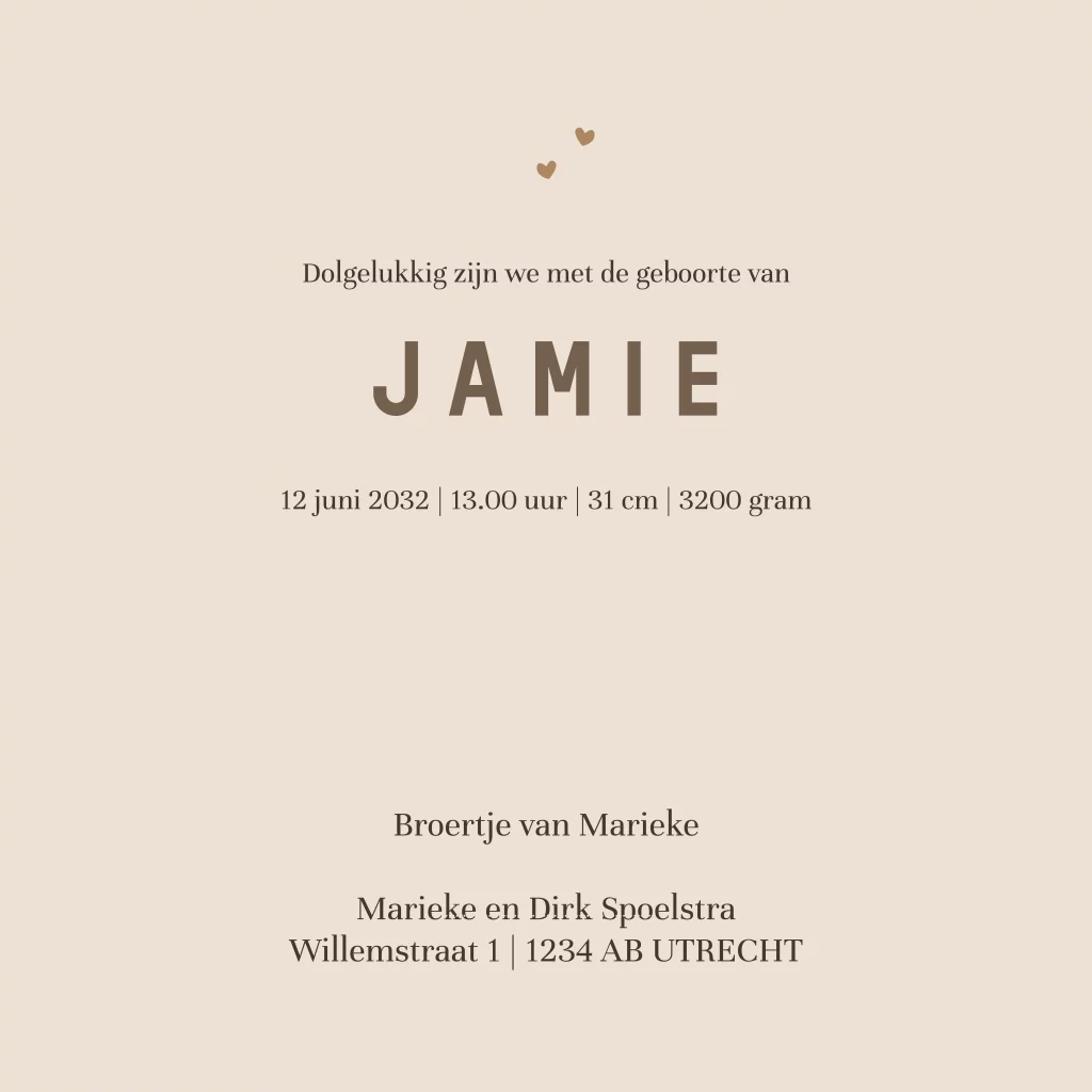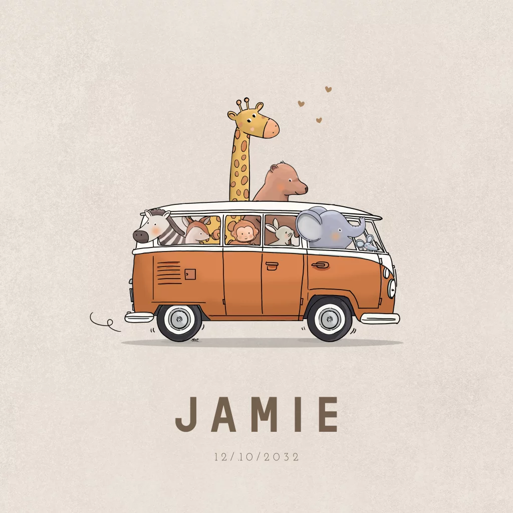 Prachtig en vrolijk geboortekaartje van mooi busje met dieren, olifant, giraf, muis, zebra, beer, konijn, aap en hertje. De achtergrond kleur is naar wens aanpasbaar. Mooie doorlopende binnenkant met dieren die in het busje zitten. Volkswagenbusjes zijn al lang een geliefd motief op geboortekaartjes. Dit busje met schattige dieren is een schitterend voorbeeld van een origineel en leuk geboortekaartje. Het design is uniek en de kleur oranje maakt het busje echt opvallen. Het geboortekaartje is ook voorzien van een koperfolie accent, wat het geheel een luxe uitstraling geeft.