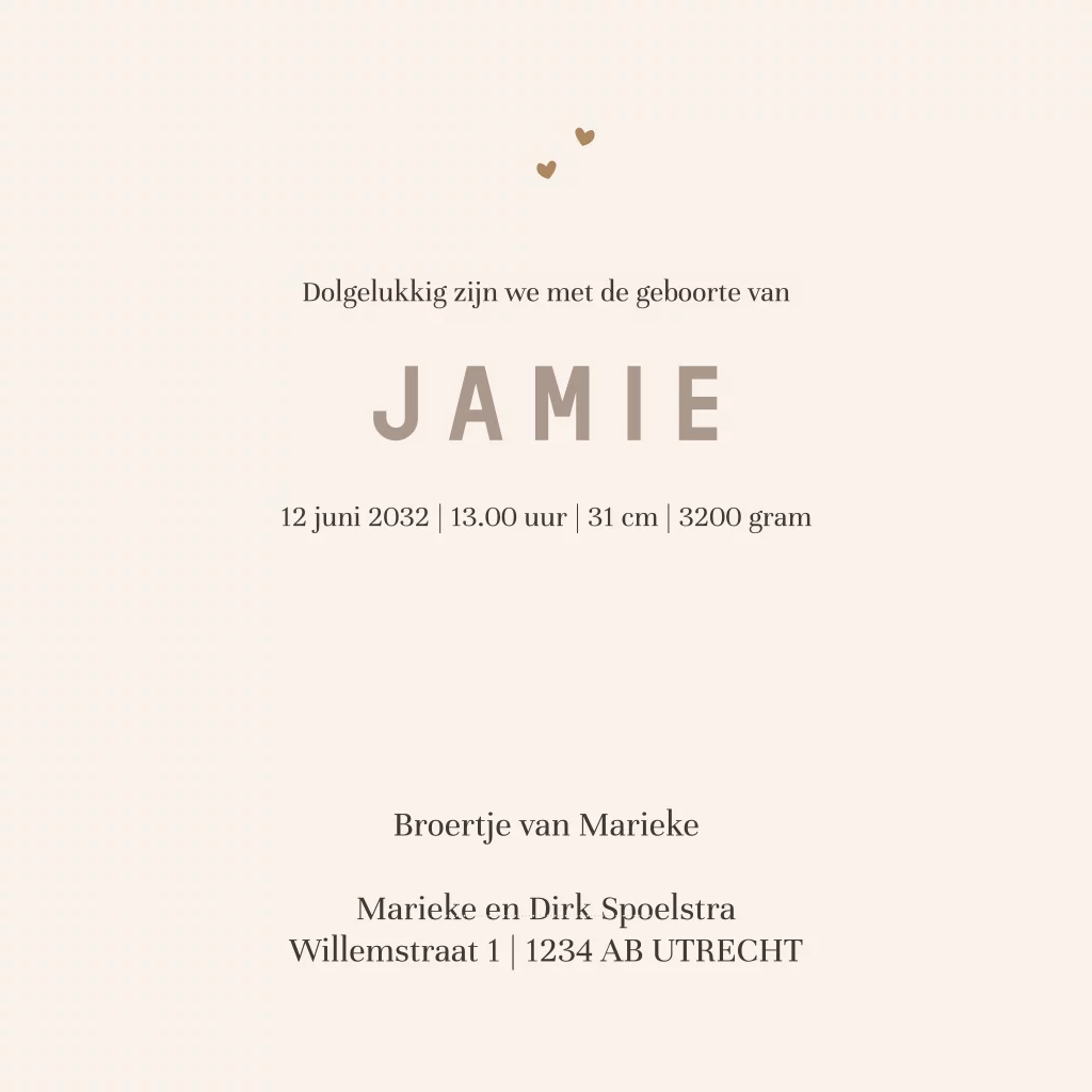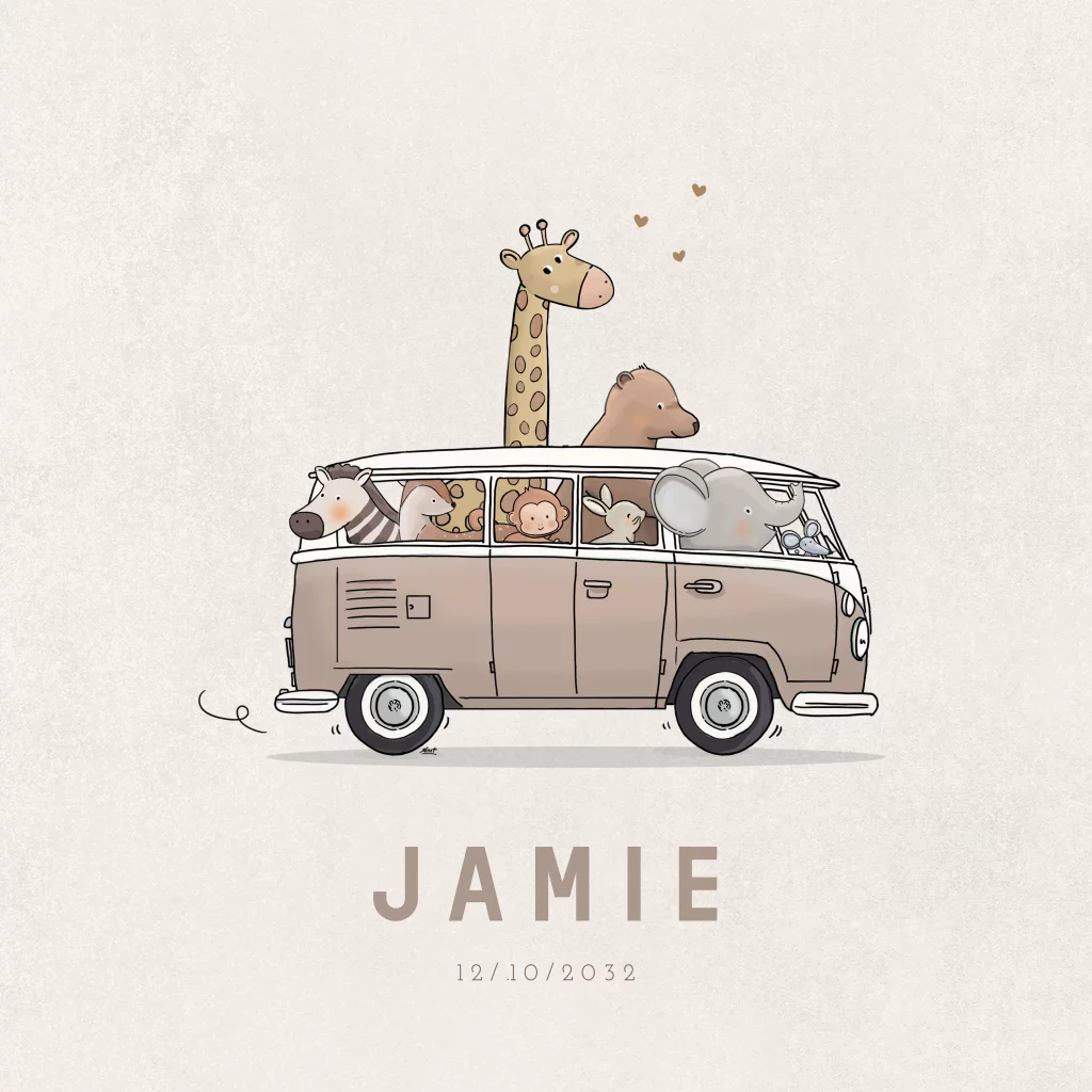 Geboortekaartje vwbusje met dieren beige tinten met daarin, giraf, beer, olifant, muis, zebra, hert, aap en konijn. Wat een stijlvol en prachtig geboortekaartje