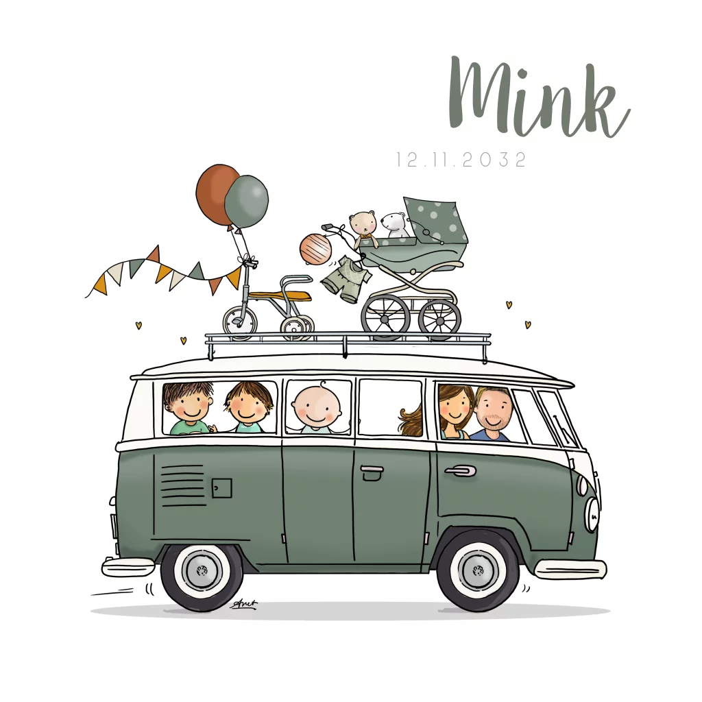 Geboortekaartje baby jongen in groen volkswagen busje met ouders en broertjes met hond. De afbeeldingen je vervangen uit de clipart, zelf samenstellen naar wens, veel plezier met het ontwerpen.