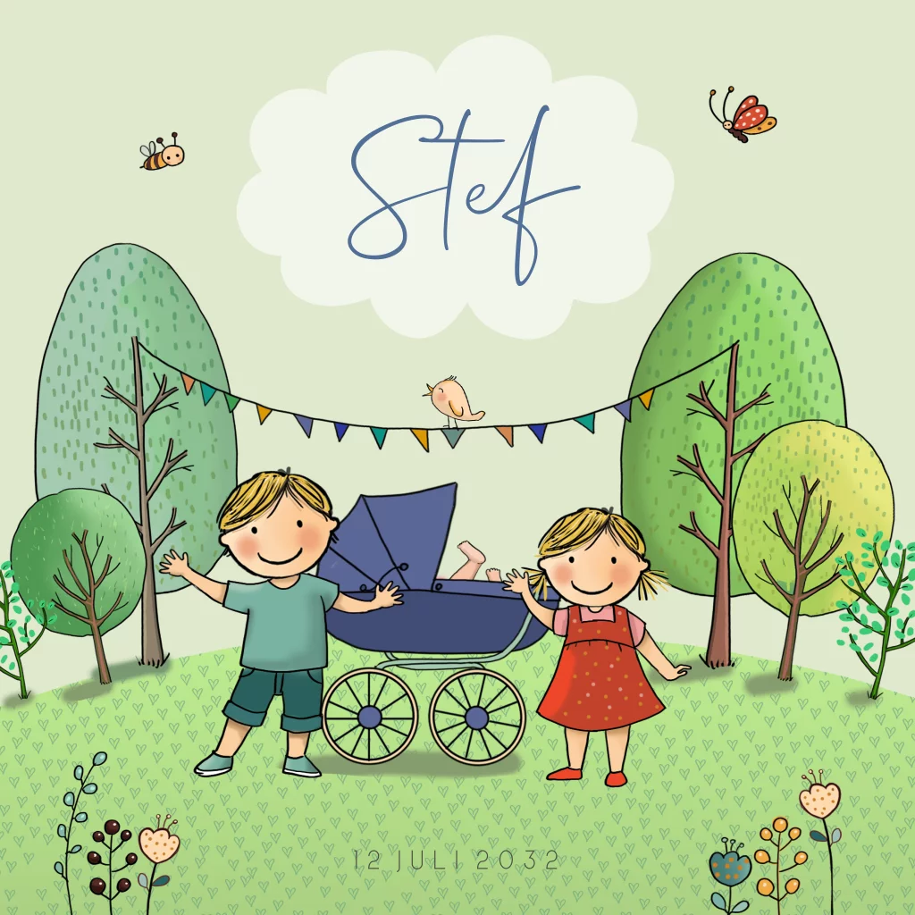 Geboortekaartjes jongen kinderwagen en broer en zusje met fris landschap met bomen, vlaggetjes, bloemen en diertjes, zoals een vlinder, bij en vogel. De achtergrond is naar wens aanpasbaar in de clipart.