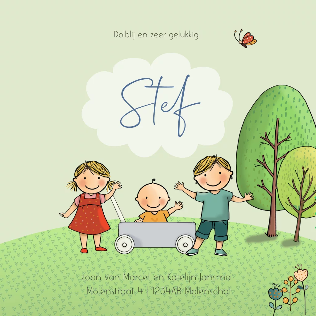 Geboortekaartjes jongen kinderwagen broer zusje met bomen