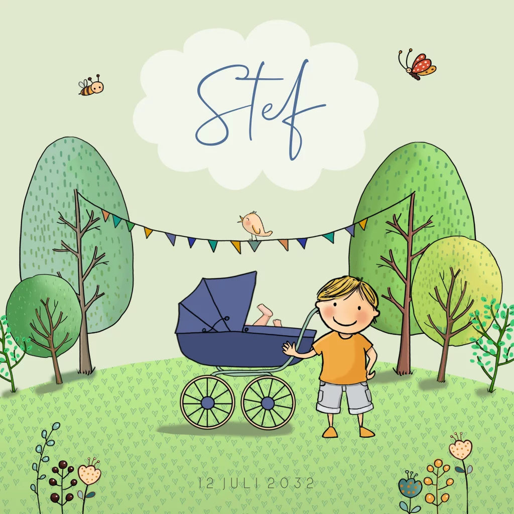 Geboortekaartjes jongen kinderwagen en broertje met fris landschap met bomen, vlaggetjes, bloemen en diertjes, zoals een vlinder, bij en vogel. De achtergrond is naar wens aanpasbaar in de clipart.