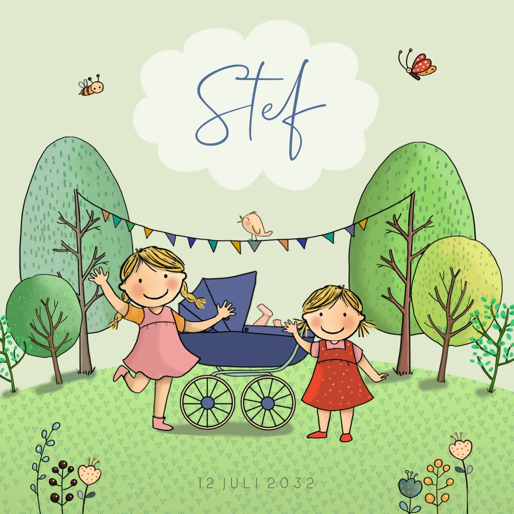 Geboortekaartjes jongen kinderwagen en zusjes met fris landschap met bomen, vlaggetjes, bloemen en diertjes, zoals een vlinder, bij en vogel. De achtergrond is naar wens aanpasbaar in de clipart.