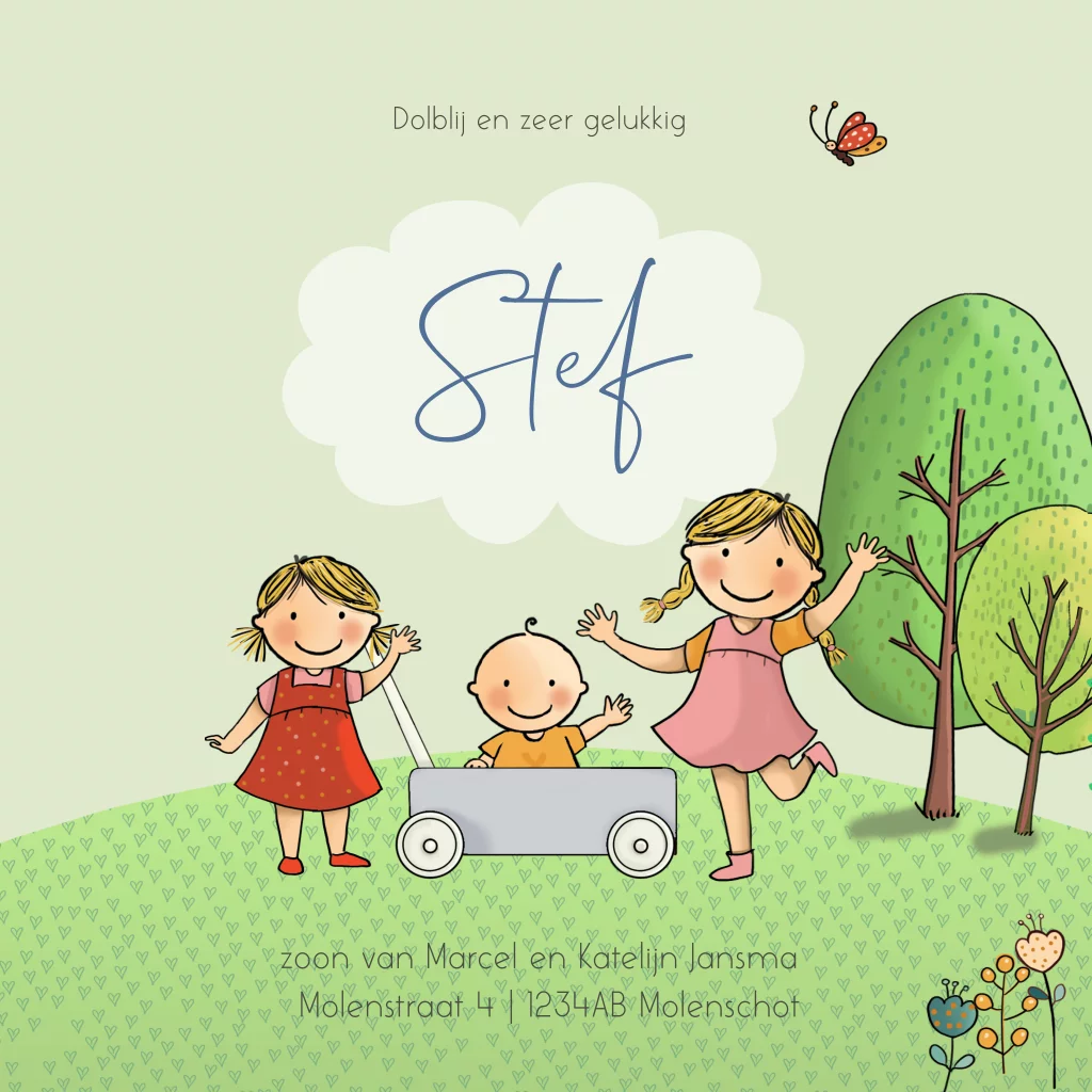 Geboortekaartjes jongen kinderwagen zusjes met bomen