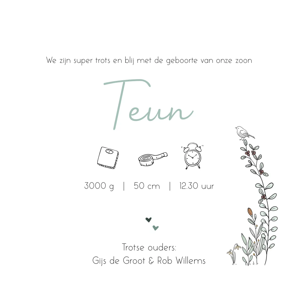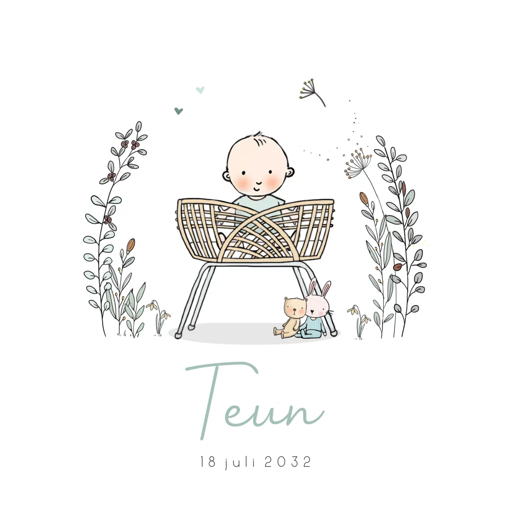 geboortekaartjes jongen rotan wiegje met takjes in groen