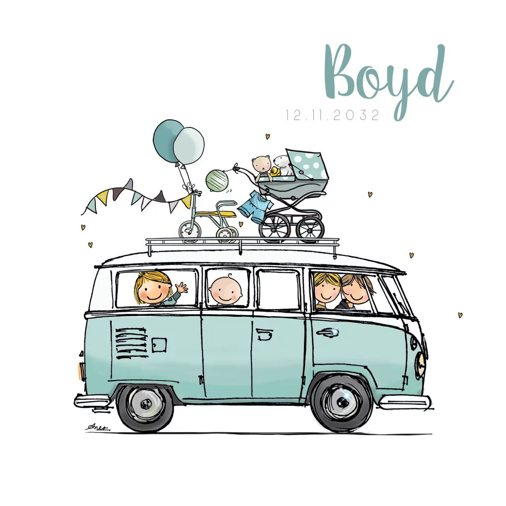 Geboortekaartje baby jongen in volkswagen busje roze met ouders en zusje. De afbeeldingen je vervangen uit de clipart, zelf samenstellen naar wens, veel plezier met het ontwerpen.