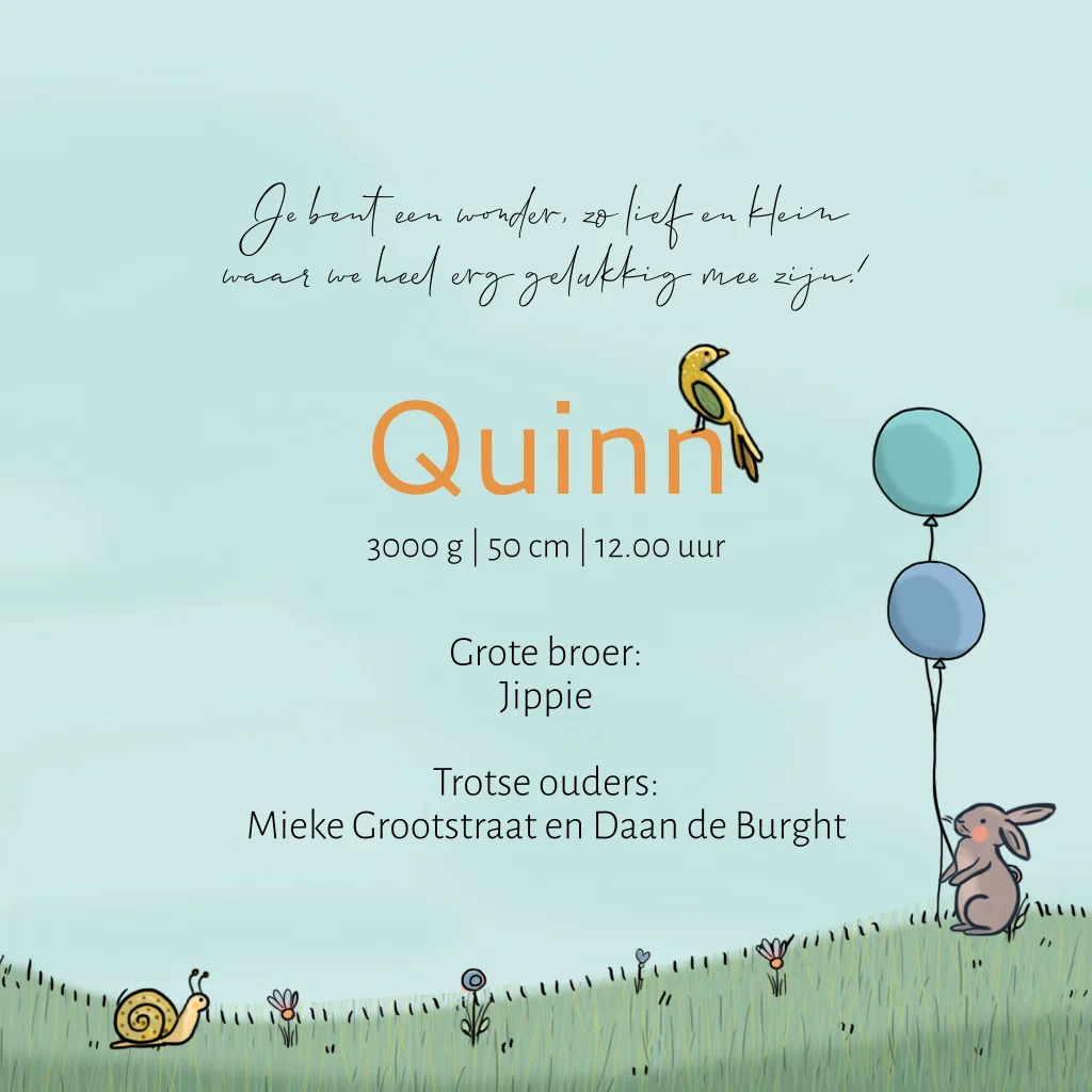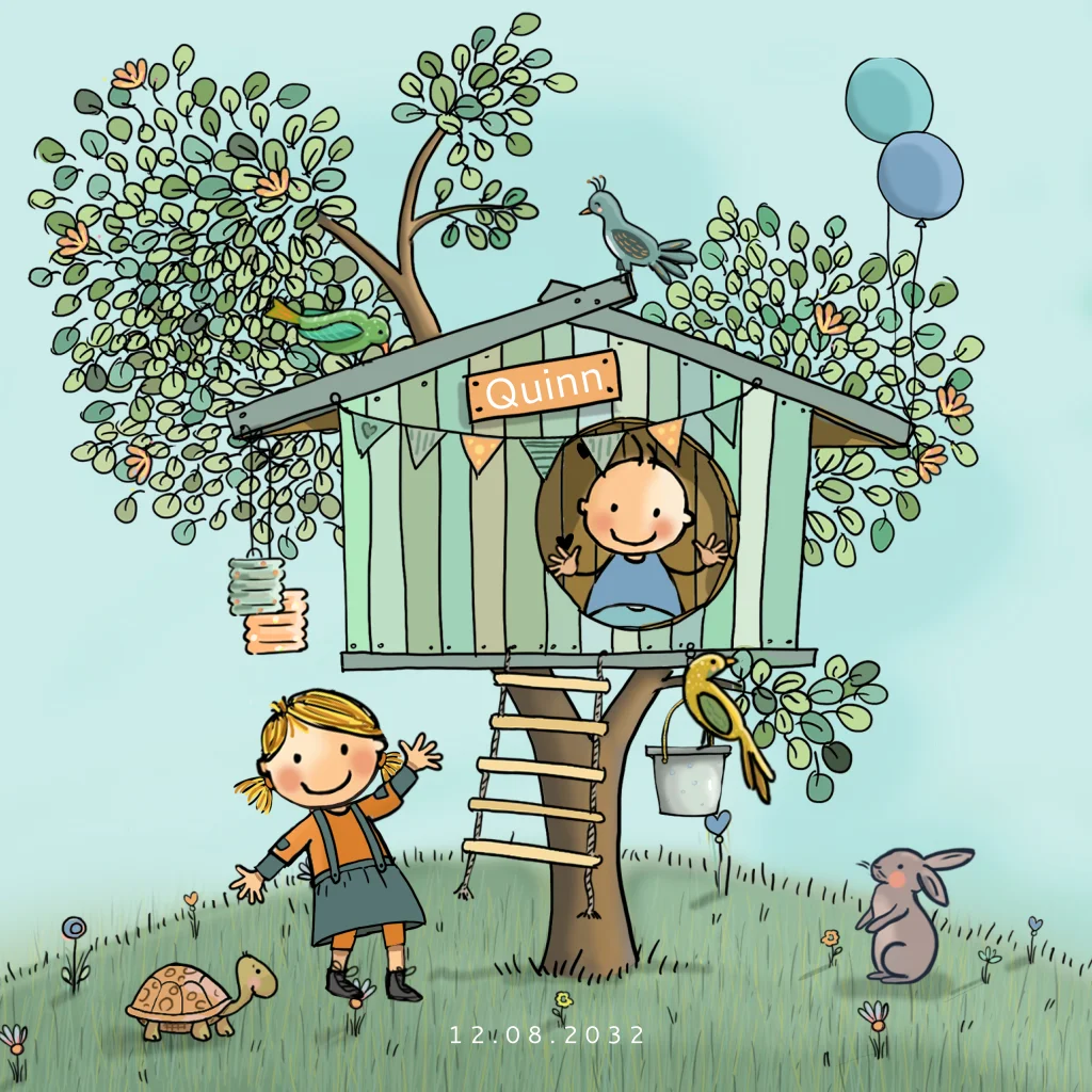Geboortekaartje jongen met zusje in mooie boomhut met laddertje, vogels, konijn en schildpad. Wat een prachtig geillustreerd kaartje!