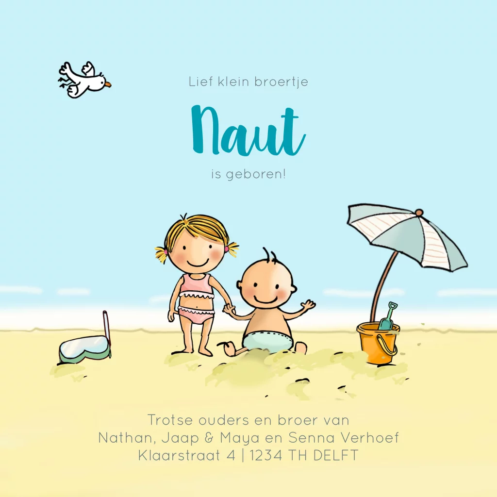 Geboortekaartje jongen strand uitkijkstoel met zusje