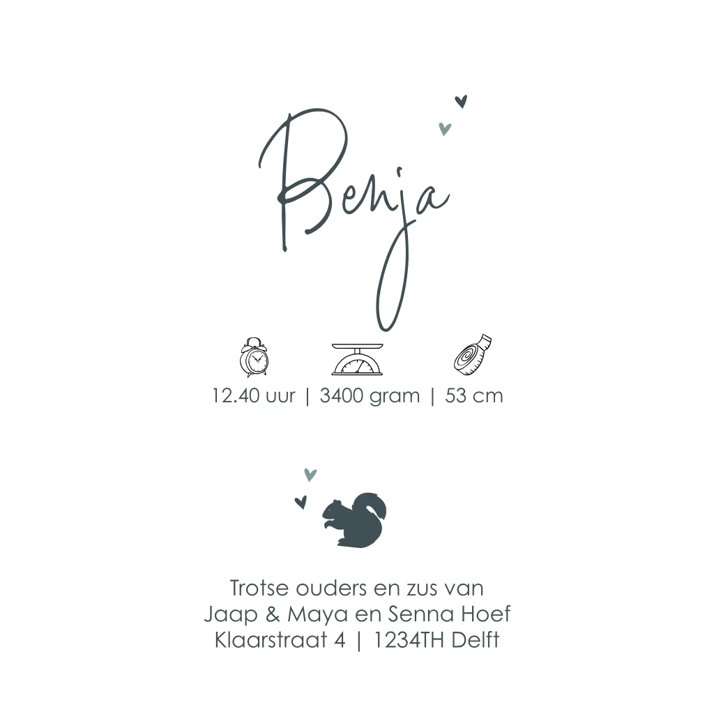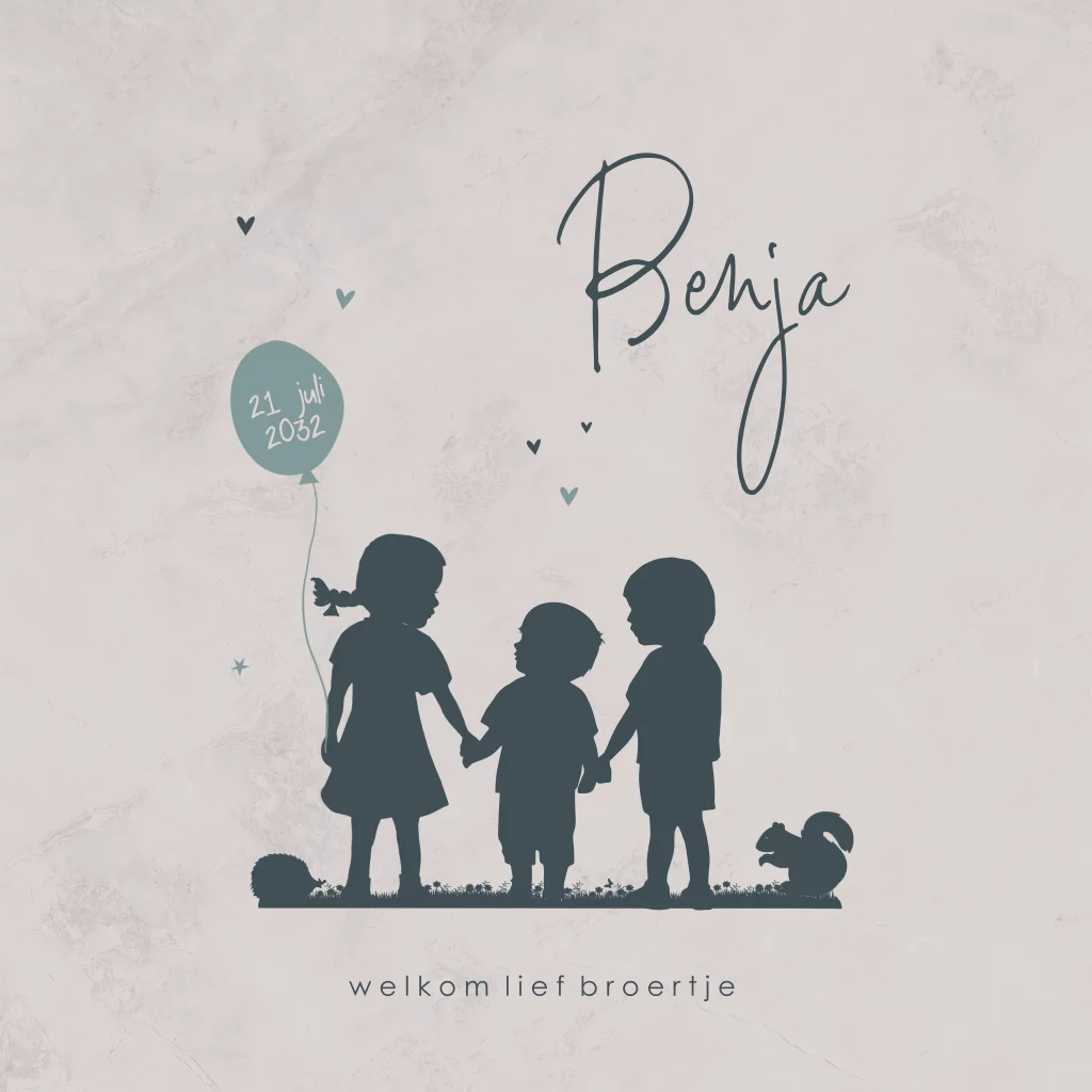 Silhouet geboortekaartje jongen met zusje en broertje, ballon en lieve eekhoorn en egeltje maken het een mooi lief kaartje.