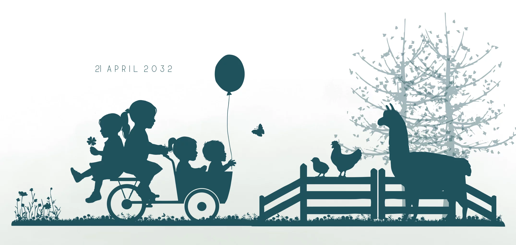 Prachtig jongen geboortekaartje van bakfiets met kinderen, hekje, lama, kippen en natuur. Deze kaart kun je naar wens aanpassen met afbeeldingen uit de clipart. Veel plezier ermee.