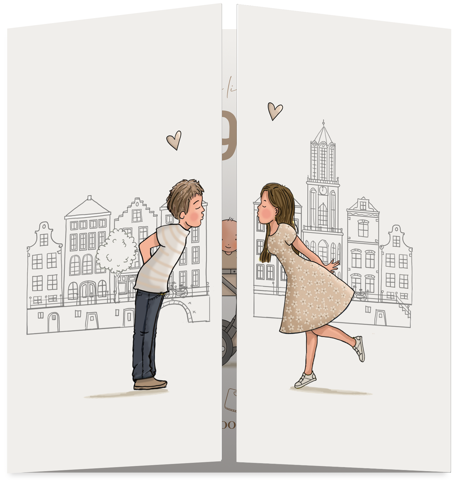 Theaterkaart kussend stel met baby. Wat zo leuk is dat de kaart verrassend openvalt in het midden. Mocht je een andere haarkleur hebben, laat gerust weten. We passen het graag aan. Ook is de achtergrond qua stad of dorp aanpasbaar.
