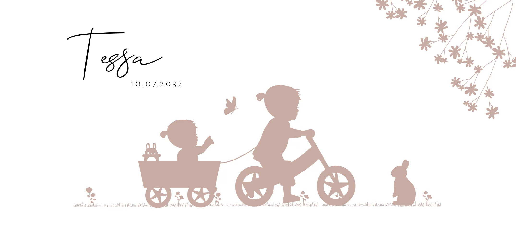 Mooi strak en stijlvol geboortekaartje van een zusje met loopfiets en karretje met baby meisje. Bloemenboom met grijs en konijntje maken het geheel mooi af.
