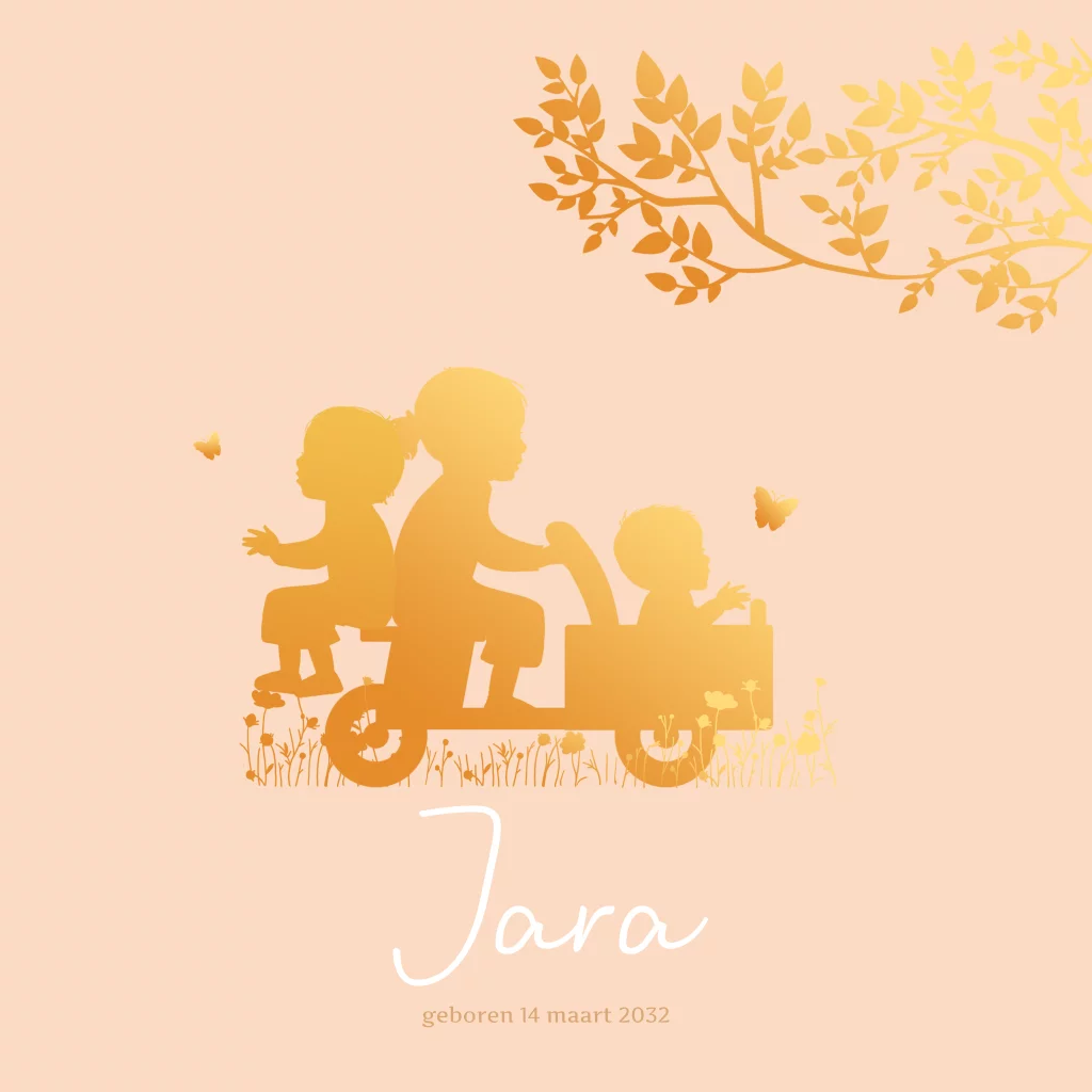 Geboortekaartje meisje houten bakfiets met broertje en rennend zusje. Let op, dit is geen goudfolie, maar goudlook. Mocht je goudfolie graag willen, laat gerust weten.