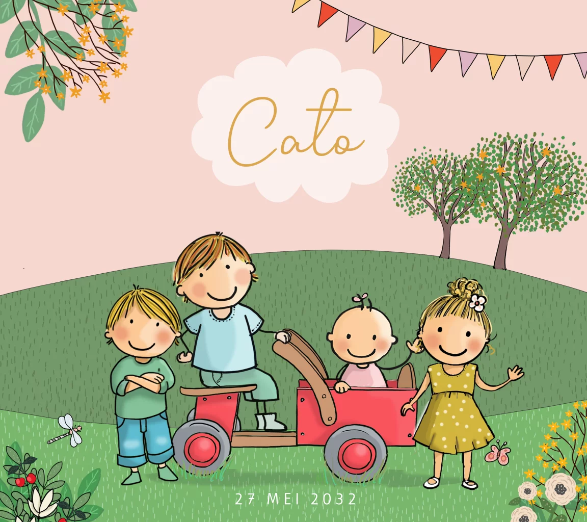 geboortekaartje broertjes zusje met baby meisje houten bakfiets
