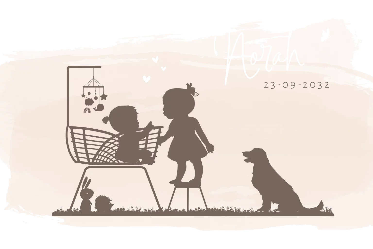 Wanneer je op zoek bent naar het perfecte geboortekaartje voor je kleine meisje, kijk dan niet verder! Ons geboortekaartje dubbel silhouet meisje rotan wieg met zusje is precies wat je nodig hebt. Dit kaartje is ontworpen met liefde en aandacht voor detail, en is perfect voor het aankondigen van de geboorte van je kleine meisje. Het kaartje is voorzien van een mooie aquarel achtergrond en bevat alle nodige details, zoals de naam van het kindje, geboortedatum, geboortetijd en geboorte gewicht. Het kaartje is ook voorzien van een korte beschrijving van het kindje, die perfect is voor het aankondigen van de geboorte van je kleine meisje.
