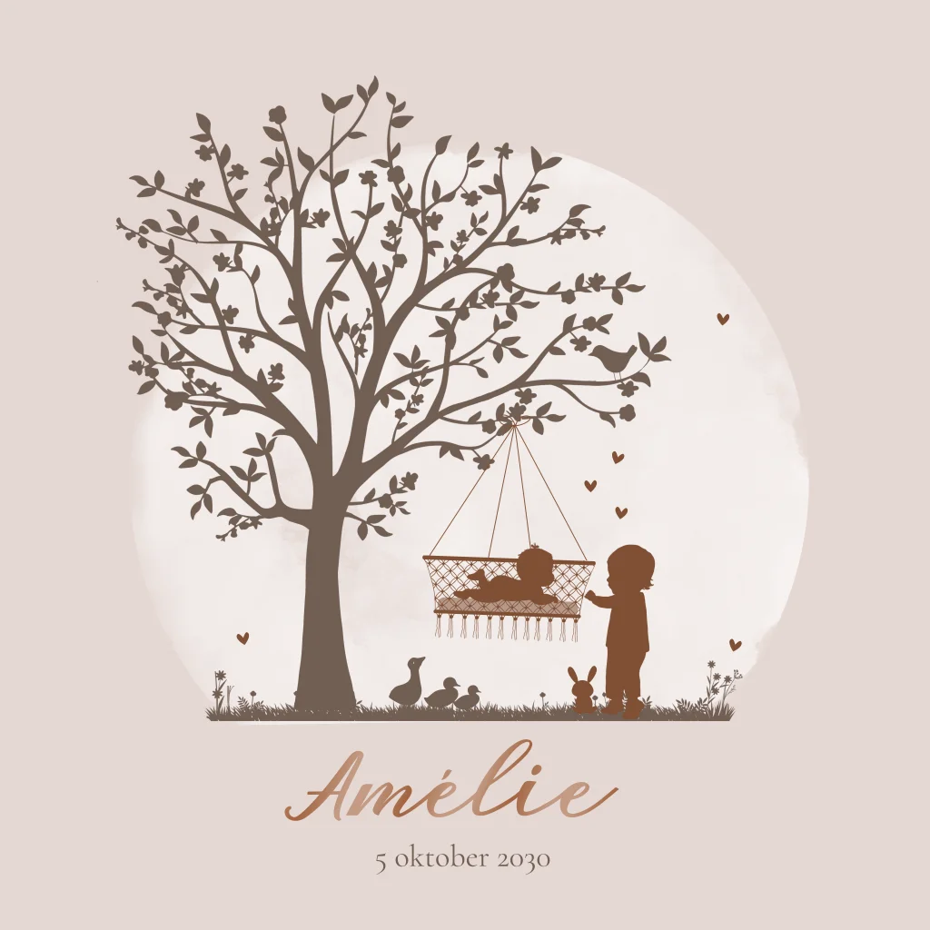 Een prachtig lief voorjaars geboortekaartje van een baby meisje in hangwiegje met broertje en mooie lenteboom met vogel. Kleine eendjes en een lieve knuffel maken het helemaal af. Super lief!