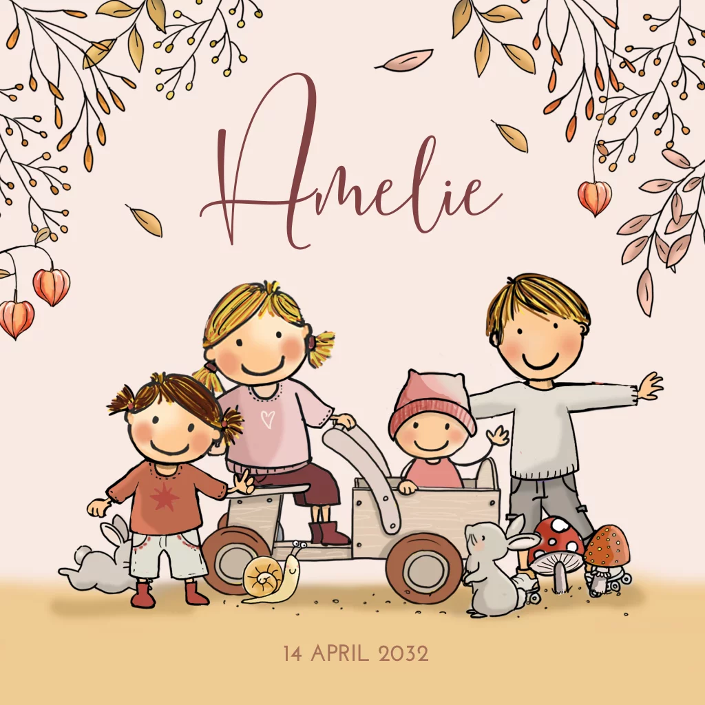 Geboortekaartje herfst broertje in houten kar met zusjes en broer. Blaadjes vallen naar beneden, leuke paddestoelen, konijntje en slakjes maken het kaartje helemaal herfst.