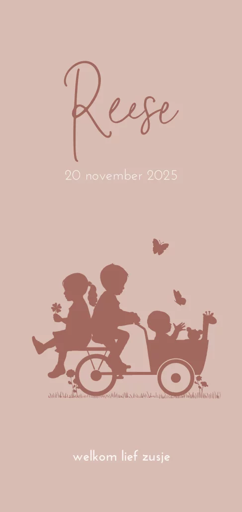 Stoer en prachtige kleur geboortekaartje van meisje in bakfiets, grote broer fiets, zusje zit achterop. Vlinders fladderen rond. Teksten zijn naar wens aanpasbaar.