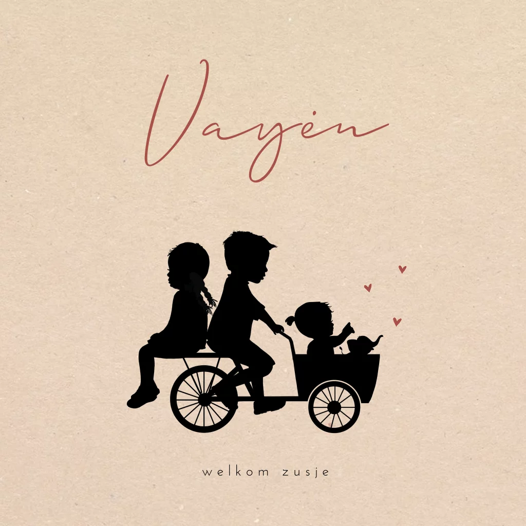 Strak maar toch eigentijds geboortekaartje voor een meisje in bakfiets. Grote broer fiets, zusje zit achterop. Achtergrond is kraftlook. Je kunt uit de clipart ook andere samenstellingen maken.