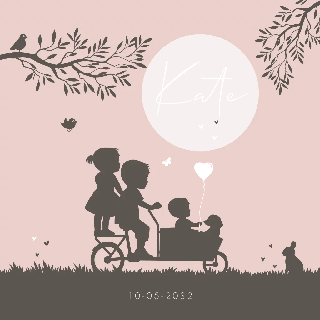 Prachtig verhalend geboortekaartje met kinderen op en in de bakfiets, natuur staat centraal met vogels en konijn, in de bakfiets zit ook nog een klein hondje. Deze kaart is naar wens aanpasbaar. Alles is vervangbaar. In de clipart staan veel leuke illustraties.