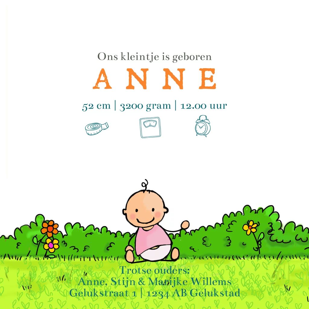 Geboortekaartje meisje bakfietsje met zusje kleurrijk, vlinder, libelle en vele bloemen zorgen voor een vrolijke kaart.