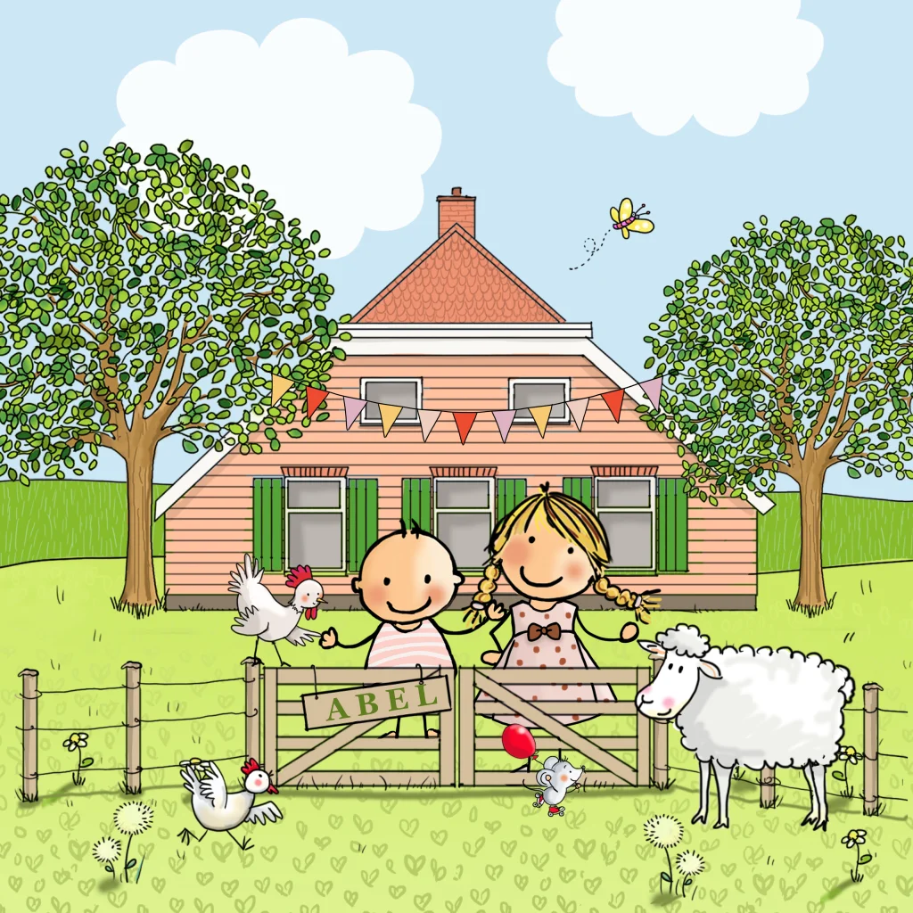 Geboortekaartje baby meisje bij hekje en boerderij met schaap en kippen, grote zus staat erbij. Super leuk hollands geboortekaartje.