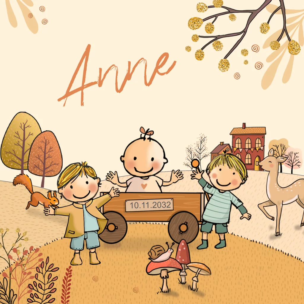 Prachtig geillustreerd geboortekaartje van een meisje en broertjes in kar met herfst achtergrond. Lieve bosdieren zijn toegevoegd zoals een eekhoorn, ree, slak en egeltje.