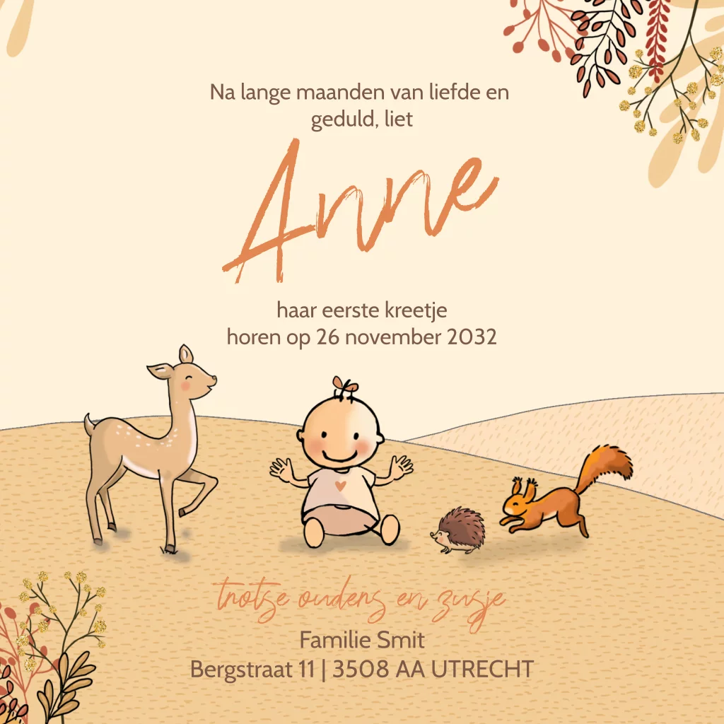 Geboortekaartje meisje broertjes herfst ree eekhoorn egel