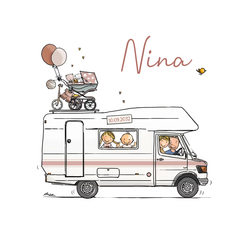Geboortekaartje meisje en zusje camper alkoof met ouders