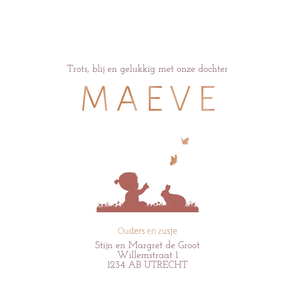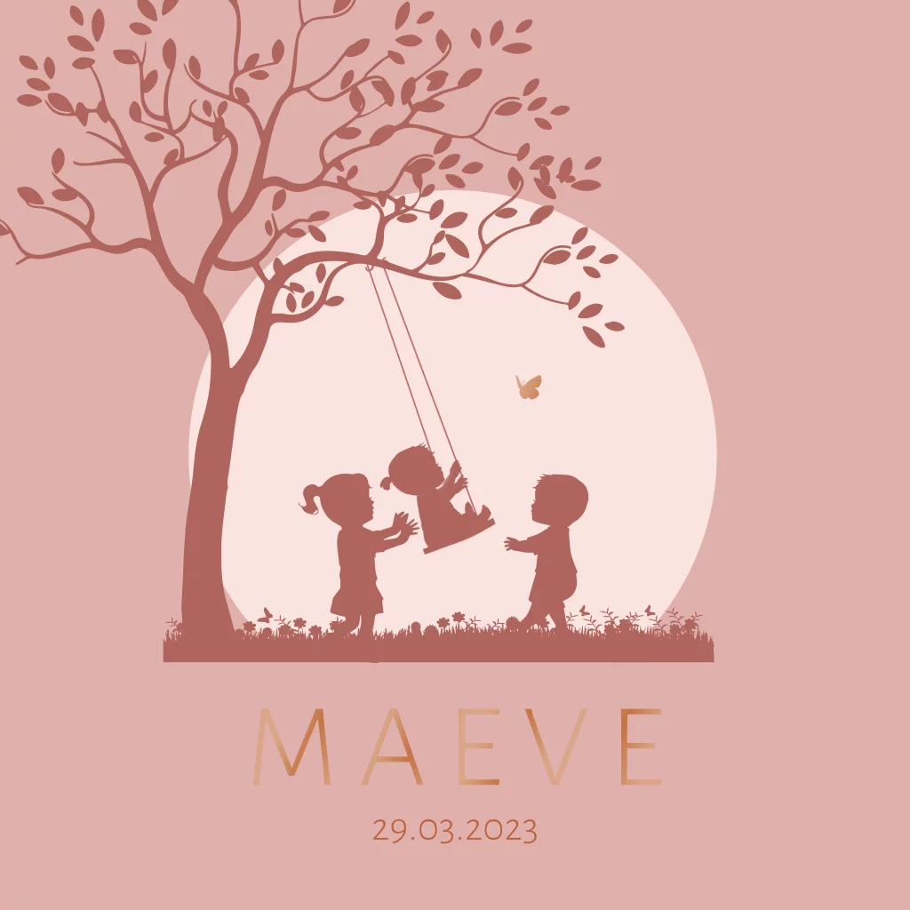 Het geboortekaartje meisje en zus en broer op schommel met boom en diertjes is een uniek en lief kaartje voor je derde kindje. Het kaartje is oudroze met een vlinder en peach tinten. De boom, diertjes en schommel zijn in een rustige bruine kleur gehouden. Het kaartje is perfect voor een meisje wat geboren wordt in de lente of zomer.