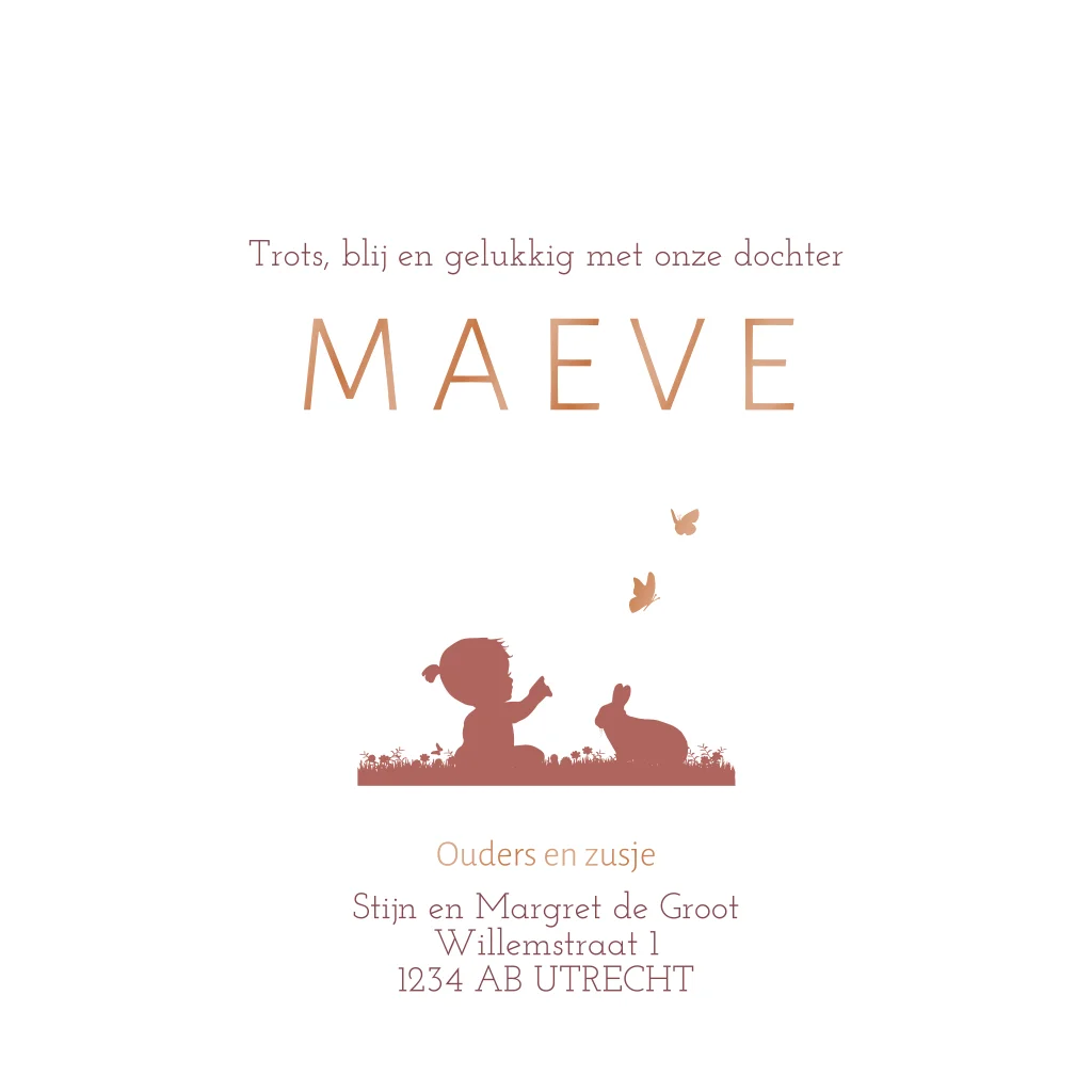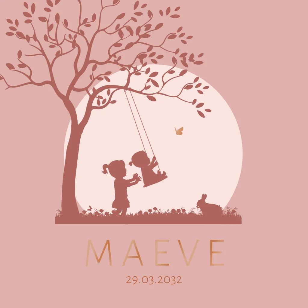 Het geboortekaartje meisje en zusje op schommel met boom en diertjes is een uniek en lief kaartje voor je tweede kindje. Het kaartje is oudroze met een vlinder en peach tinten. De boom, diertjes en schommel zijn in een rustige bruine kleur gehouden. Het kaartje is perfect voor een meisje wat geboren wordt in de lente of zomer.