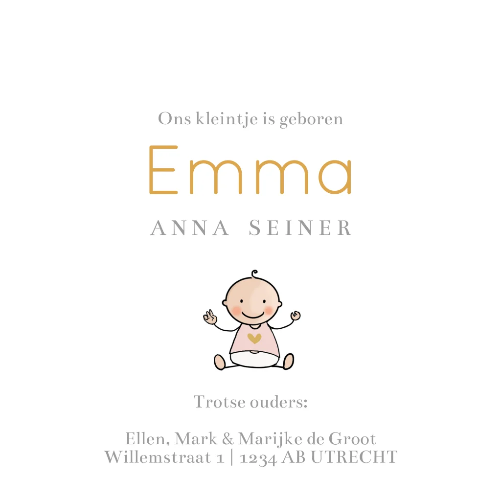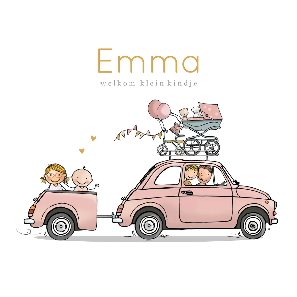 Geboortekaartje meisje Fiat 500 met aanhangwagen, alle afbeeldingen zijn los dus je kunt de kaart naar wens zelf samenstellen.