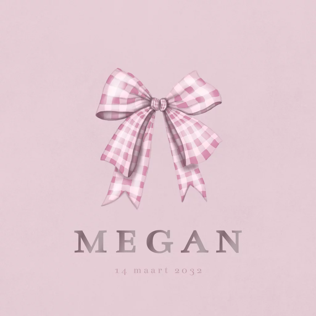 Geboortekaartje meisje geblokt strikje roze is erg schattig met een hip een strikje en een strak ontwerp eromheen.
