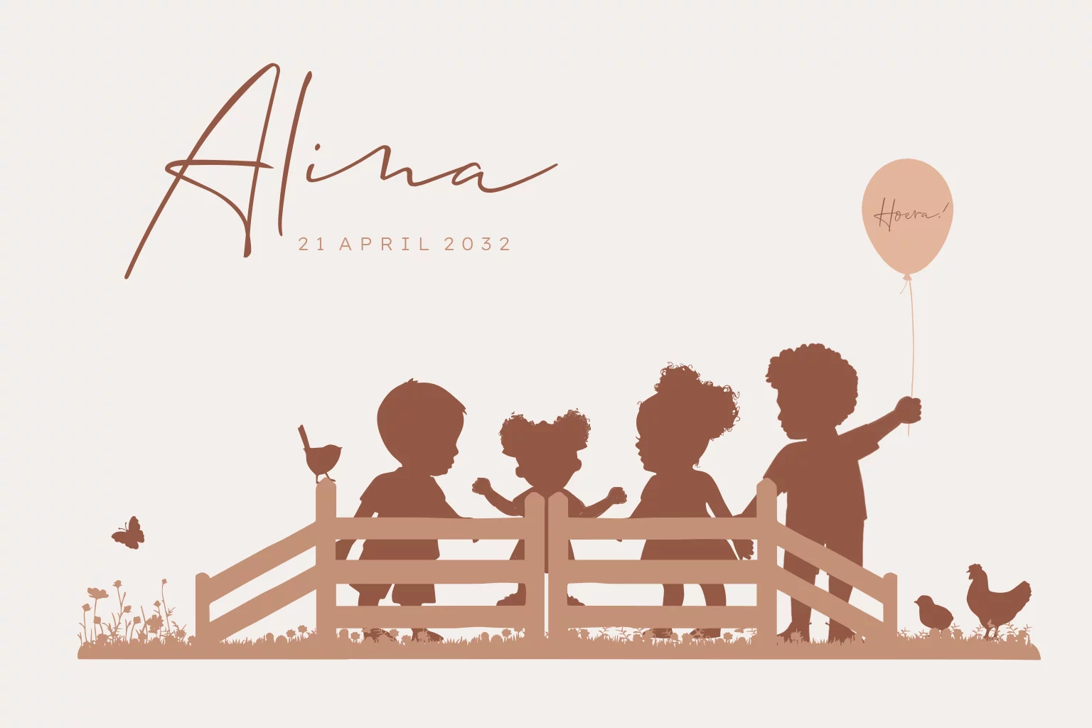 Heb je al gezien ons geboortekaartje meisje hekje met broertjes en zus? Dit schattige kaartje is perfect voor je kleine meisje en heeft alle details die je nodig hebt, van het kippetje en kuikentje met vlinder tot het vogeltje dat op het hek zit. We hebben ook de ballon en de vlinder op de achtergrond inbegrepen, zodat je kaartje echt af is.