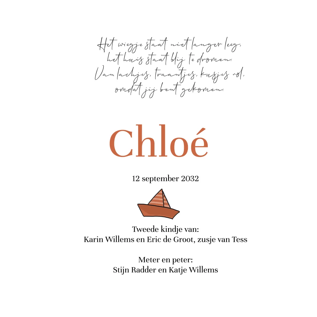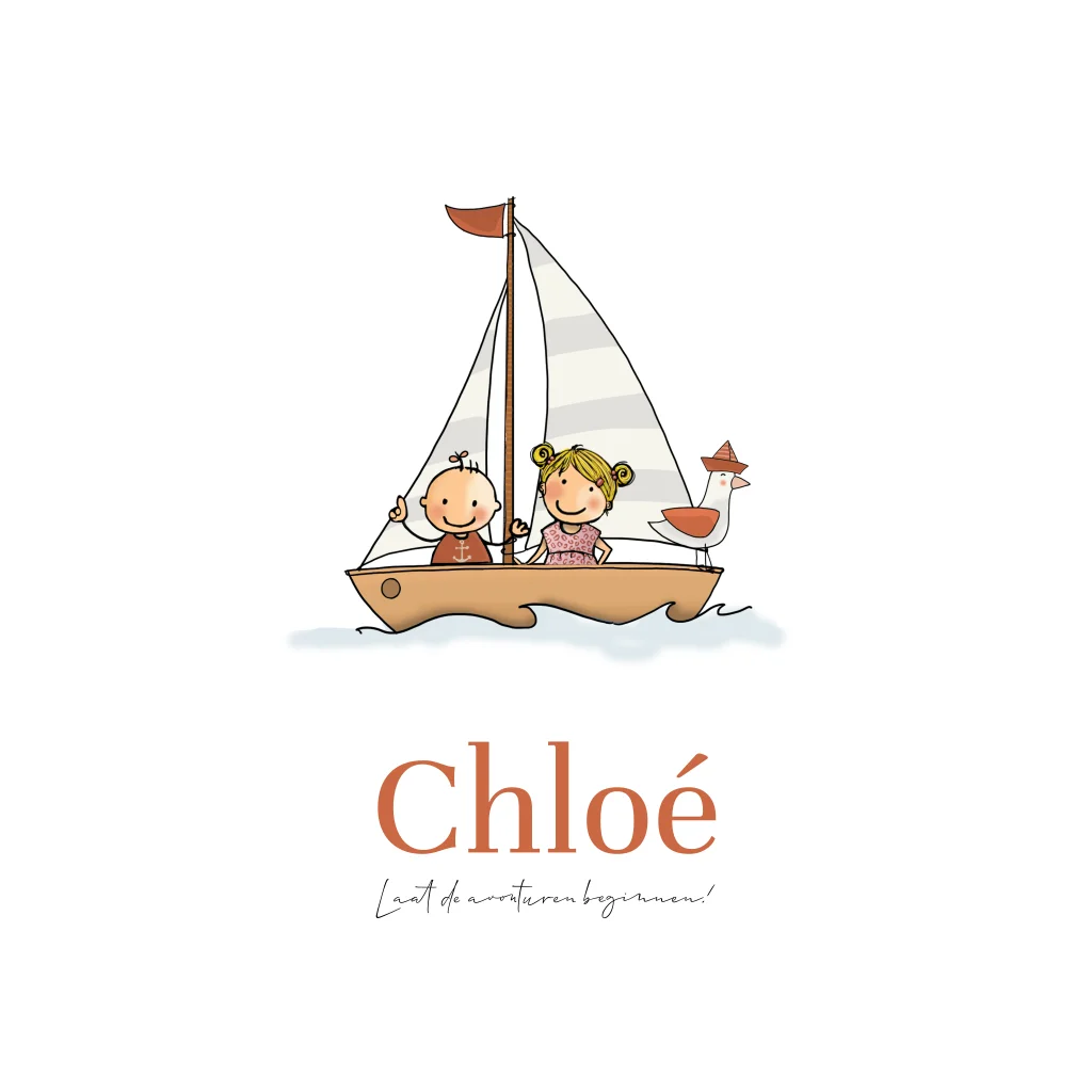Geboortekaartje meisje in bootje met zusje en meeuw, prachtig geïllustreerd kaartje met meeuw en bootje.