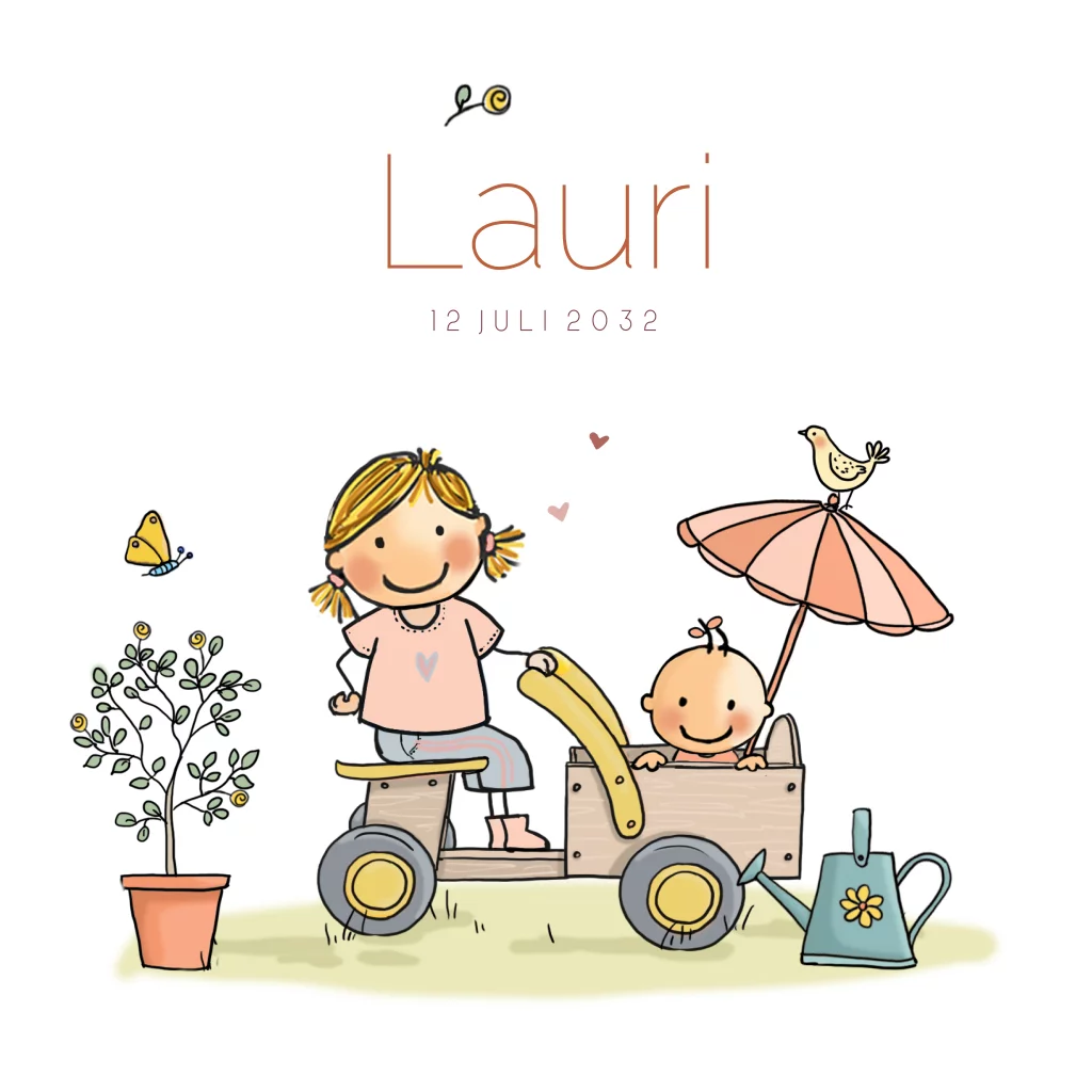 Geboortekaartje meisje in kruiwagen met zusje, boompjes en gieter met bloemen.