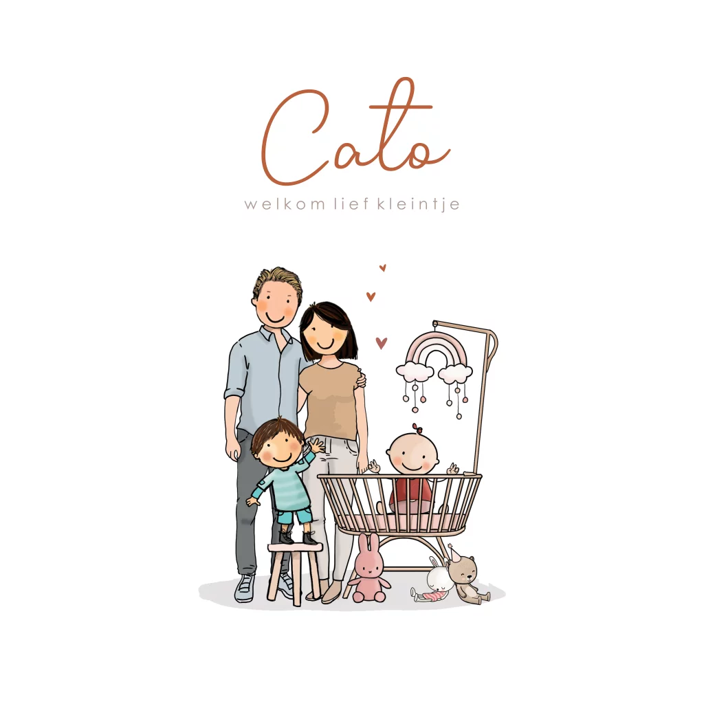 Geboortekaartje meisje in rotan wiegje met regenboog, knuffels, broertje en ouders. In de clipart staan vele leuke ouders die je kunt uitzoeken. Teksten zijn ook naar wens aanpasbaar.