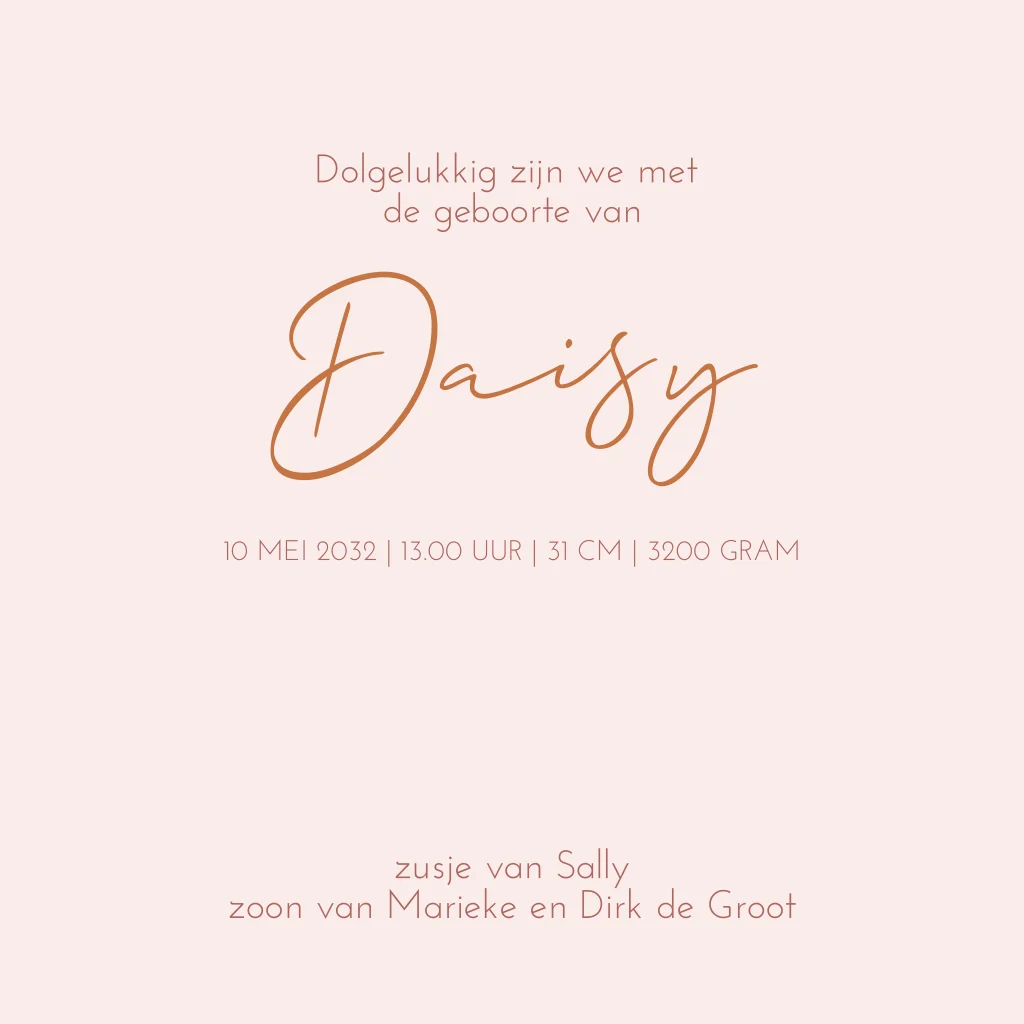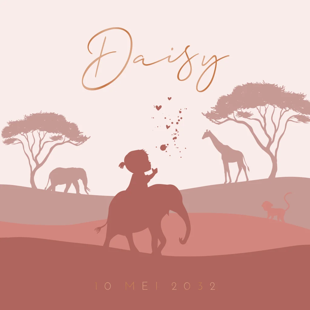 Strak maar toch warm geboortekaartje voor een meisje, meisje op zit olifant en op de achtergrond andere jungle dieren. De kaart is zelf aan te passen in andere kleuren.