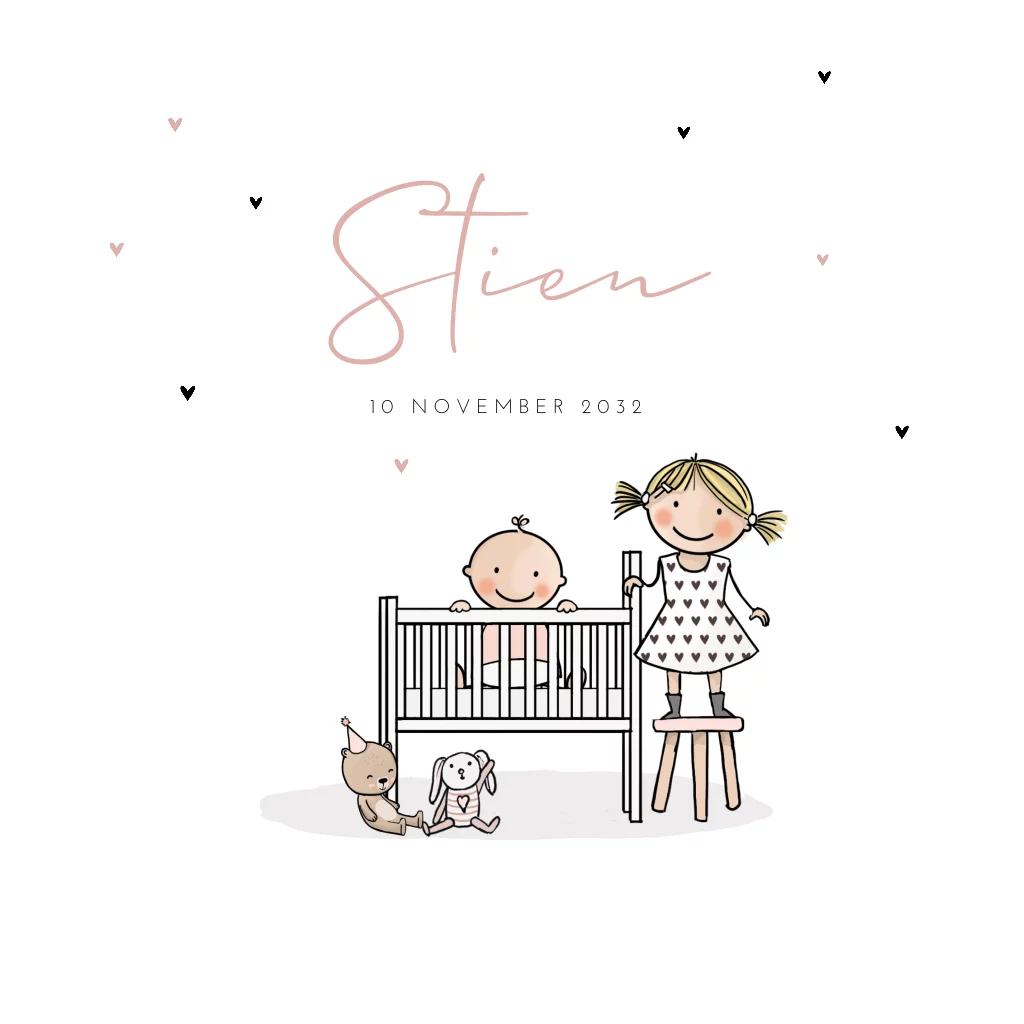 Geboortekaartje meisje in ledikant met zusje op krukje, lieve knuffels maken het af.