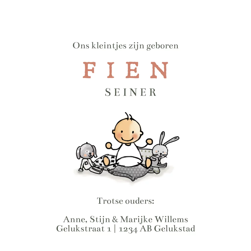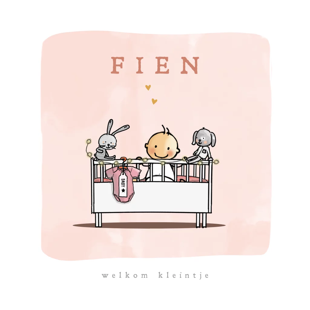 Geboortekaartje meisje ledikant wit met baby en knuffels.