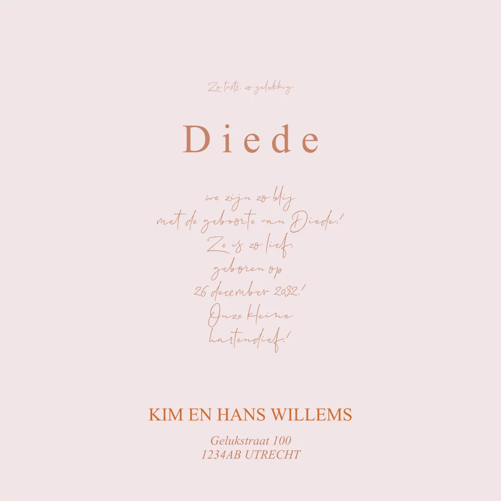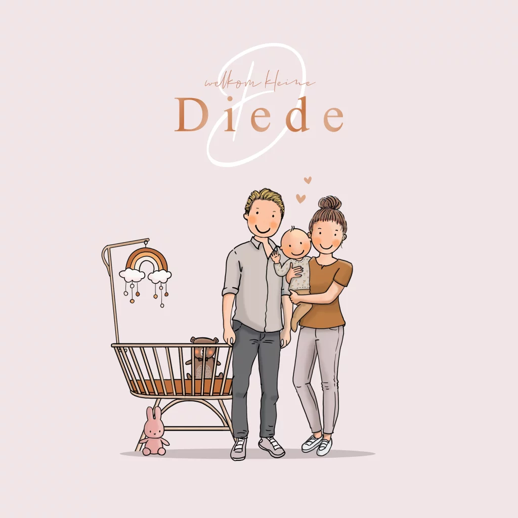 Geboortekaartje meisje met ouders en rotanwieg. Onze geboortekaartjes zijn uniek en naar wens samen te stellen. In de clipart staan diverse illustraties van leuke ouders en kinderen. Zo maak je je eigen ontwerp. Bestel vandaag nog je geboortekaartje en maak je kaartje uniek met onze clipart!